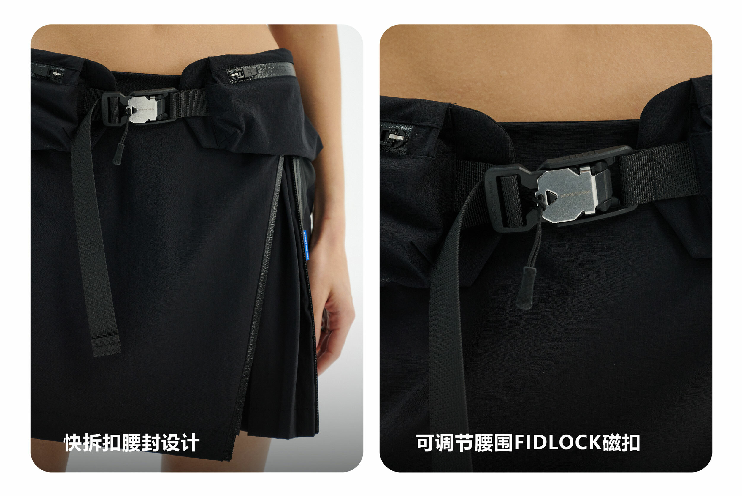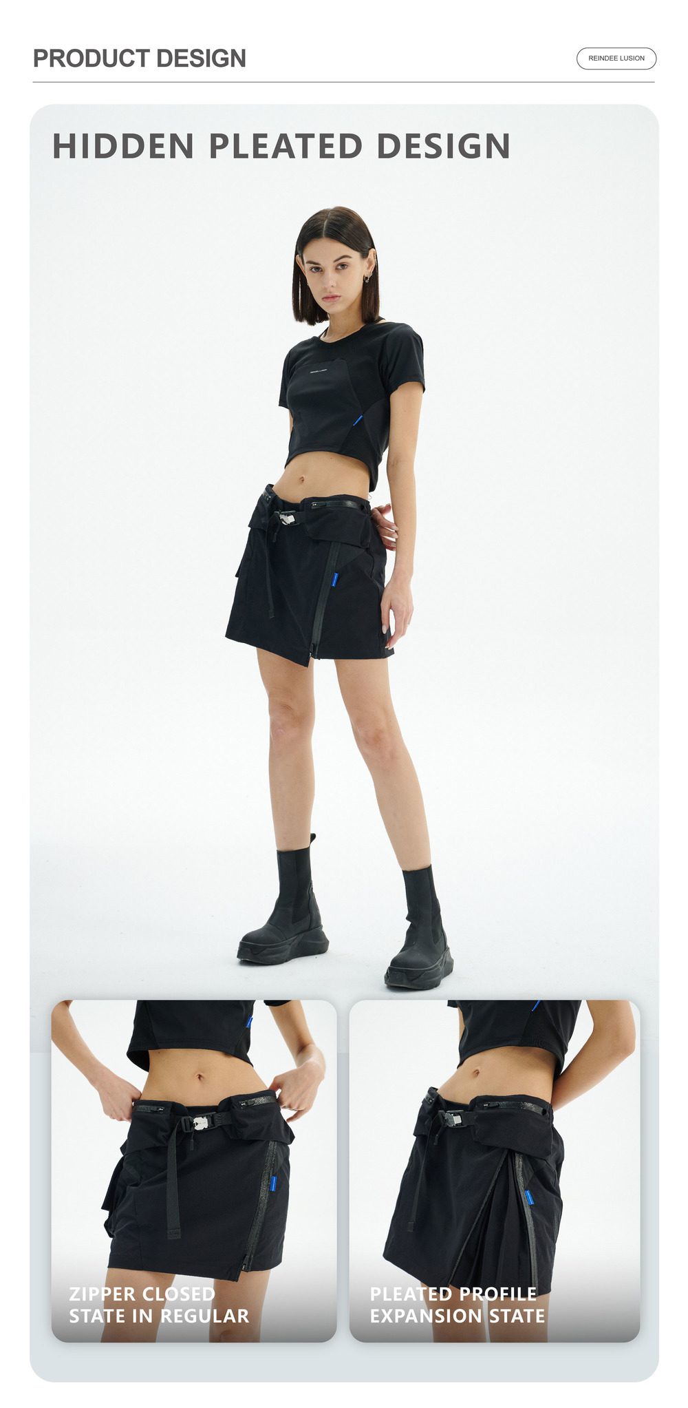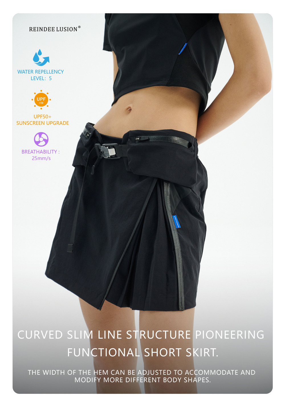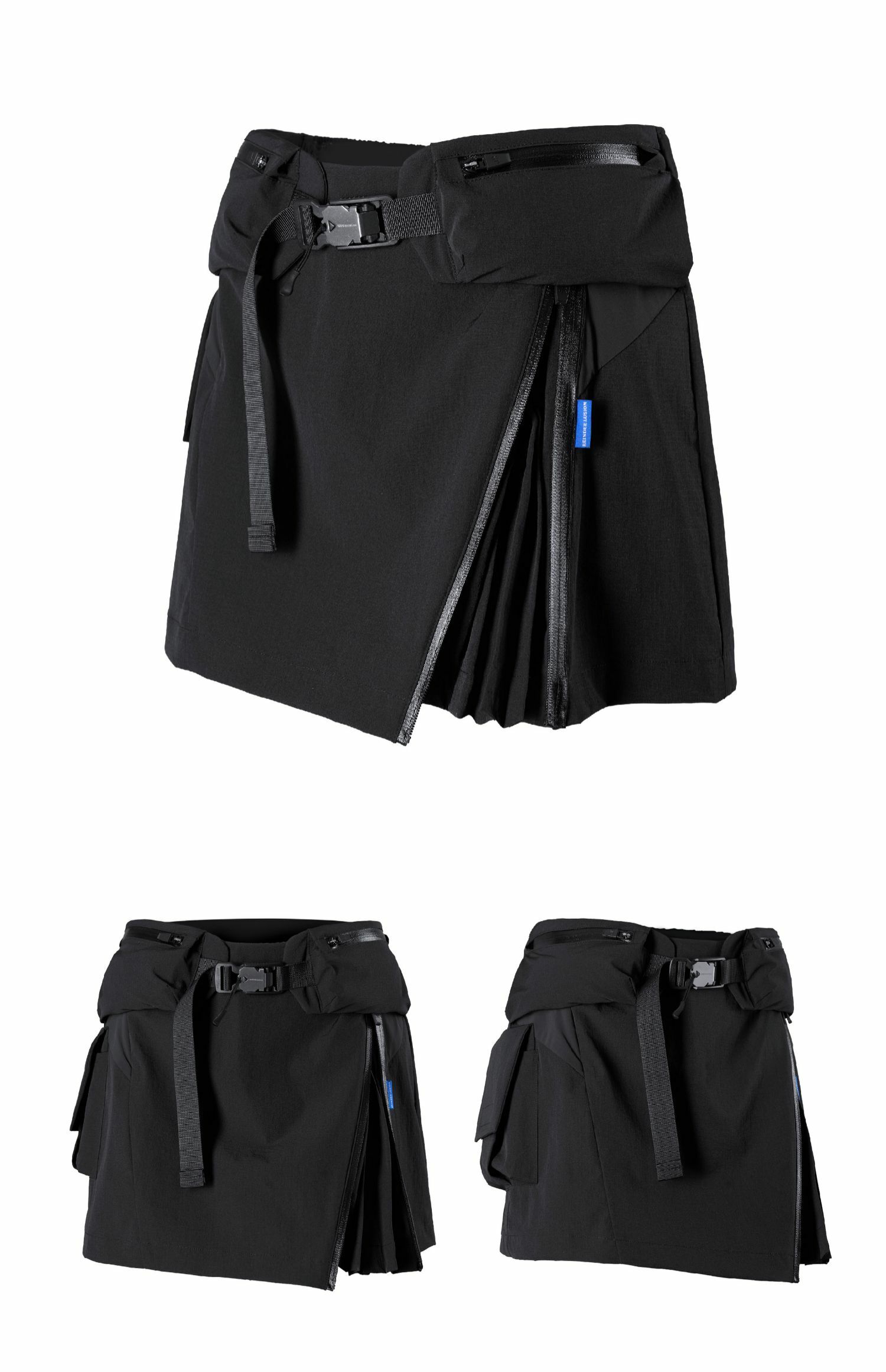 Curved slim line structure pioneering functional short skirt. The width of the hem can be adjusted to accommodate and modify more different body shapes.