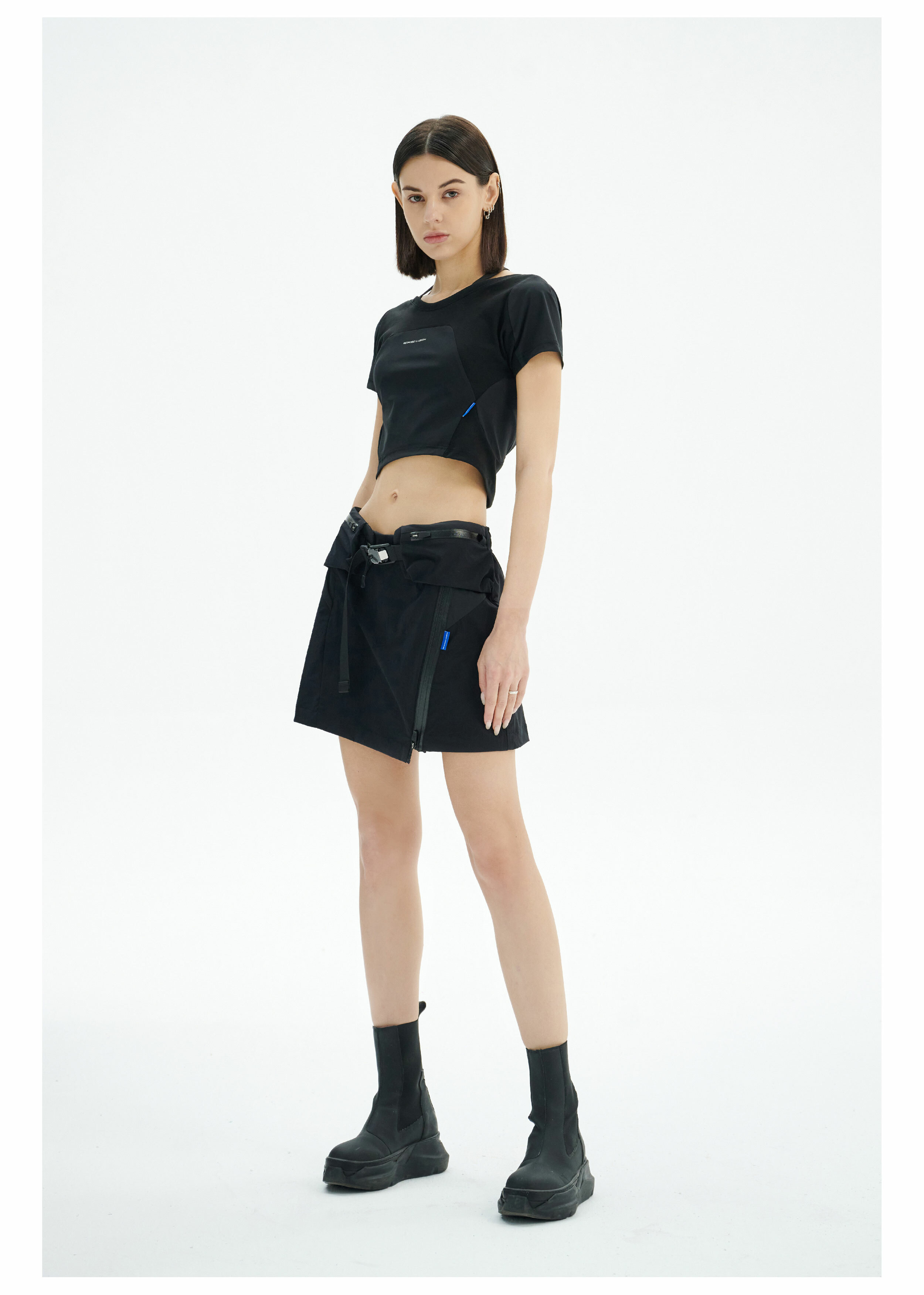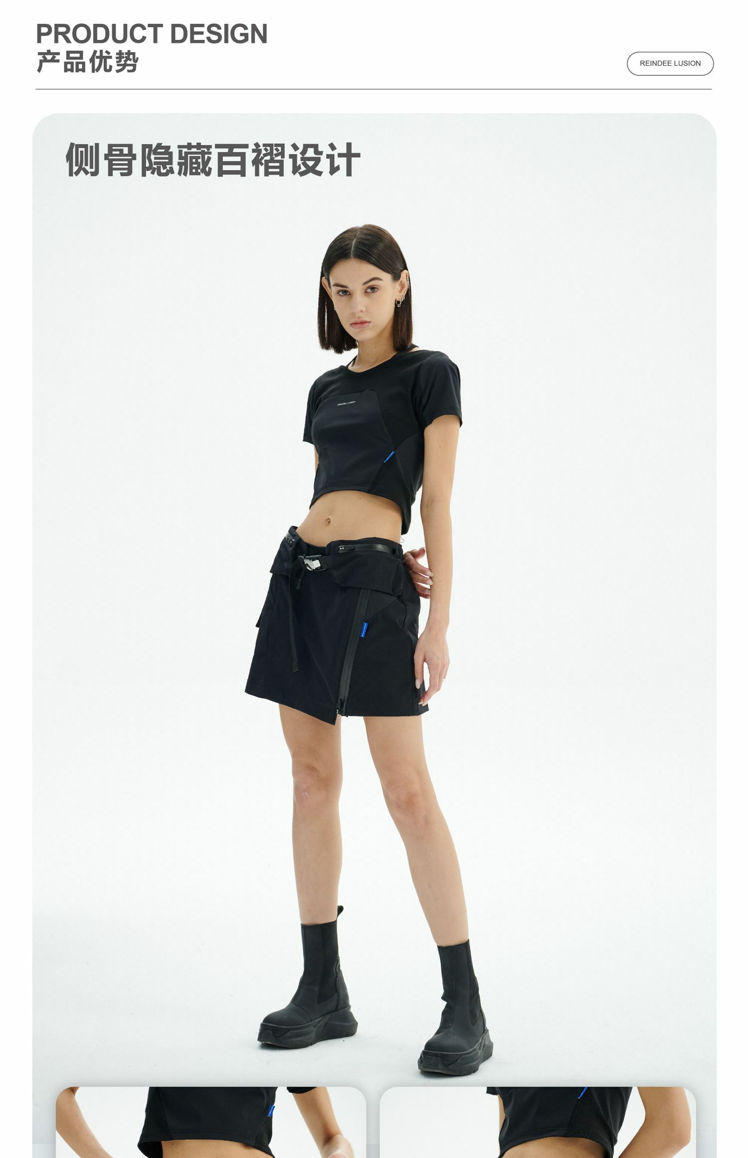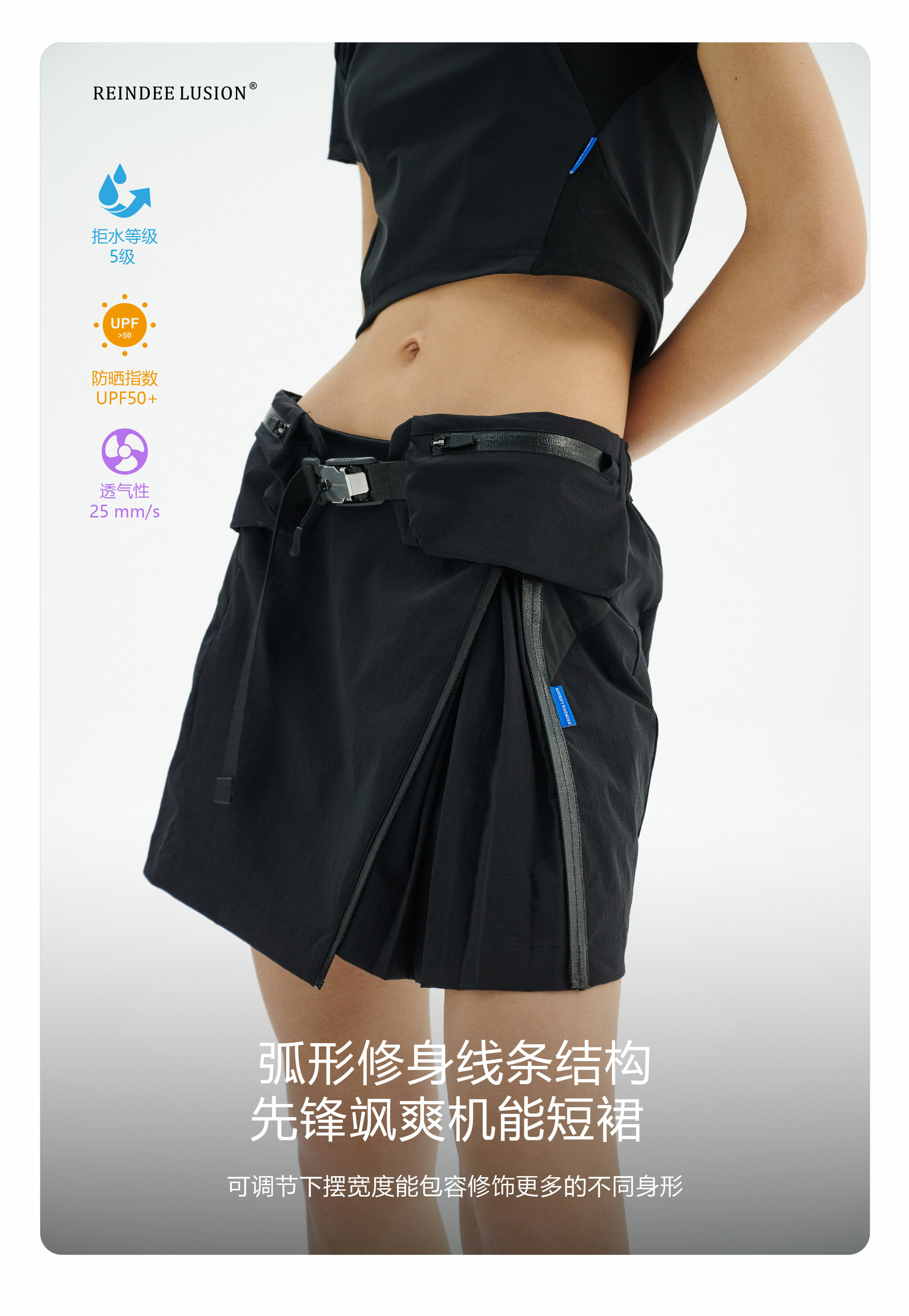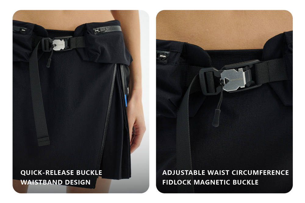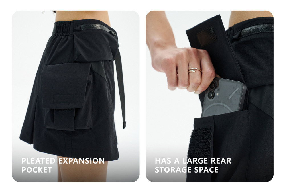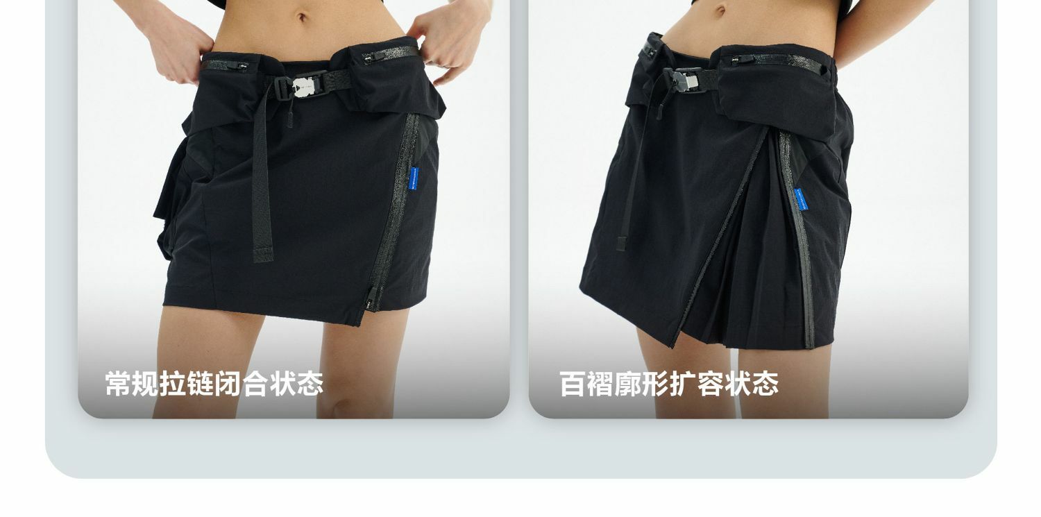 Curved slim line structure pioneering functional short skirt. The width of the hem can be adjusted to accommodate and modify more different body shapes.