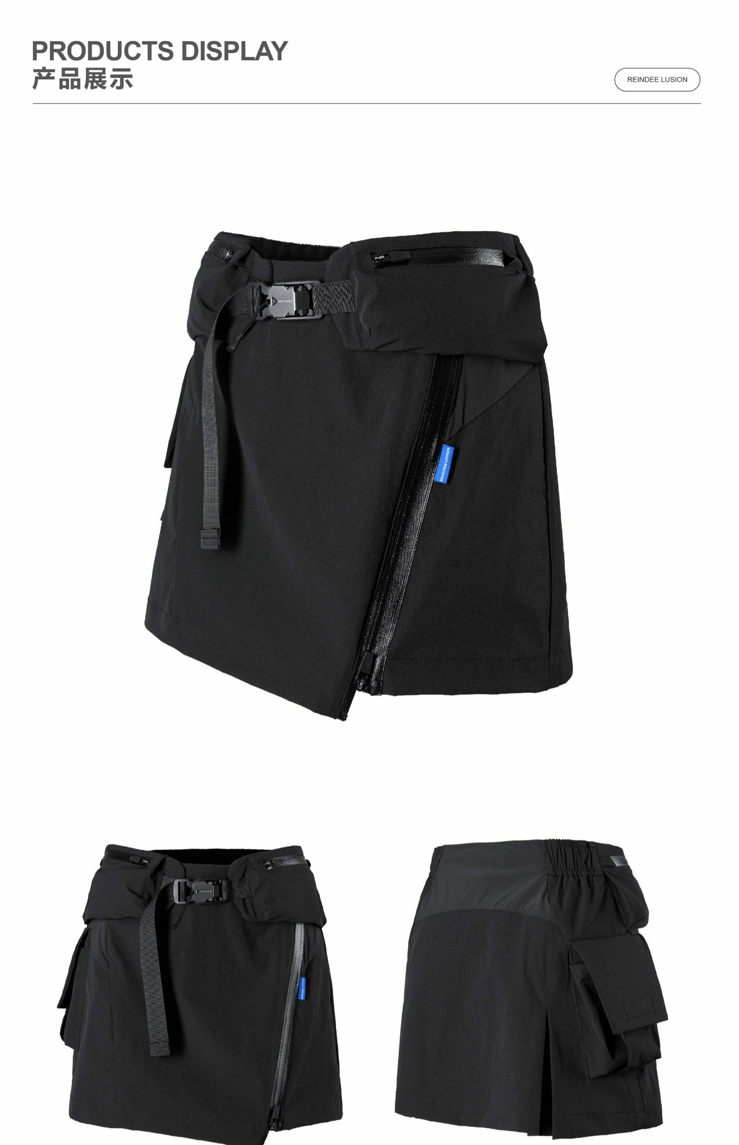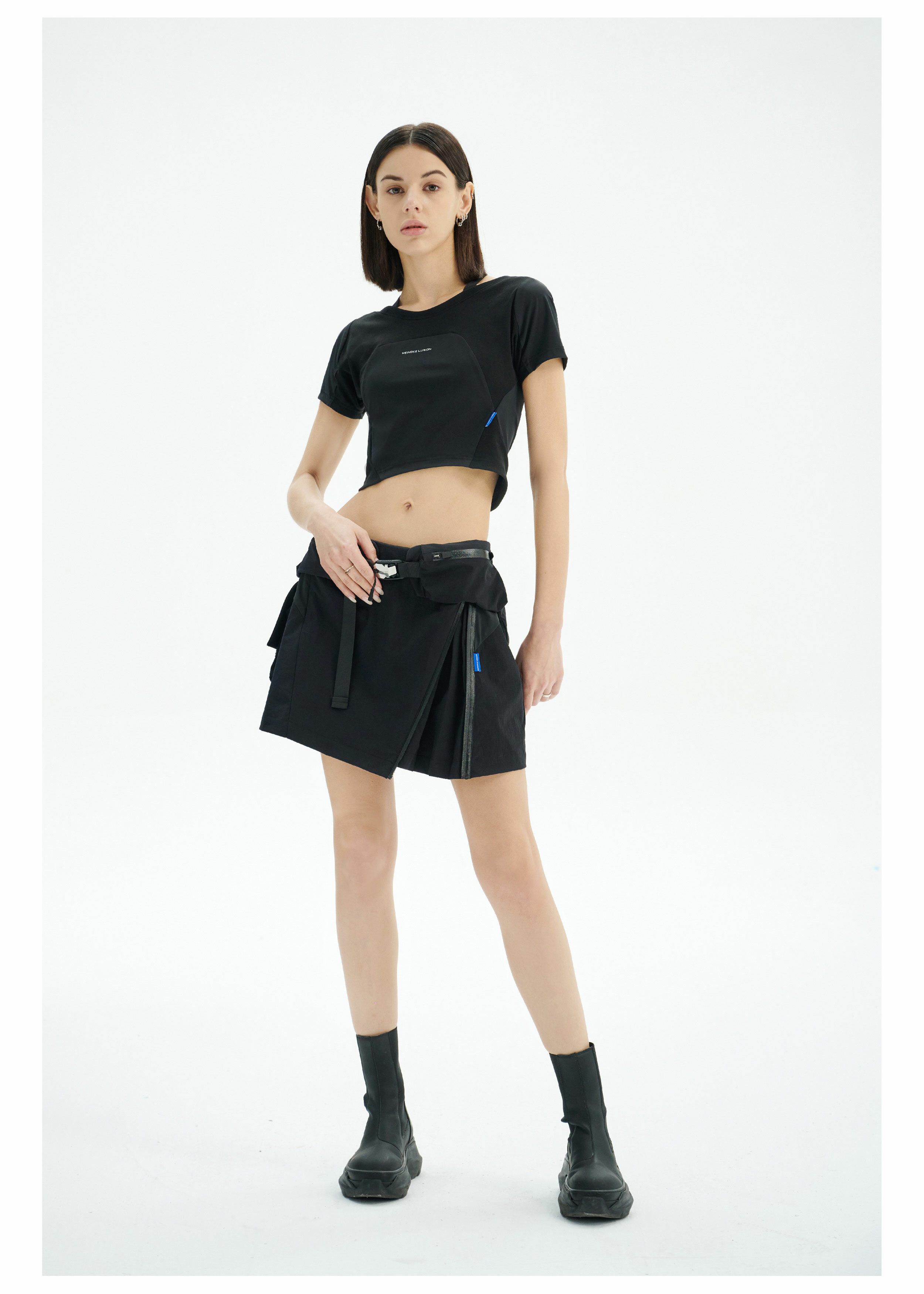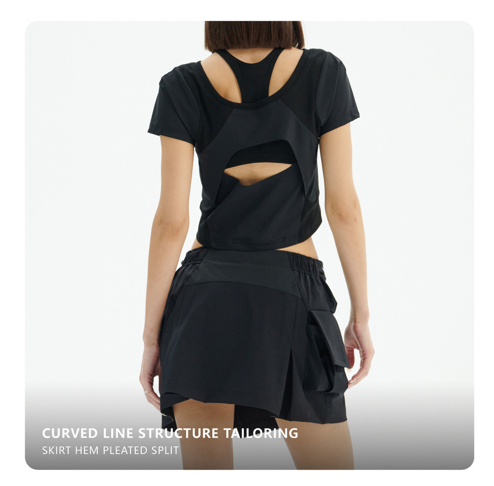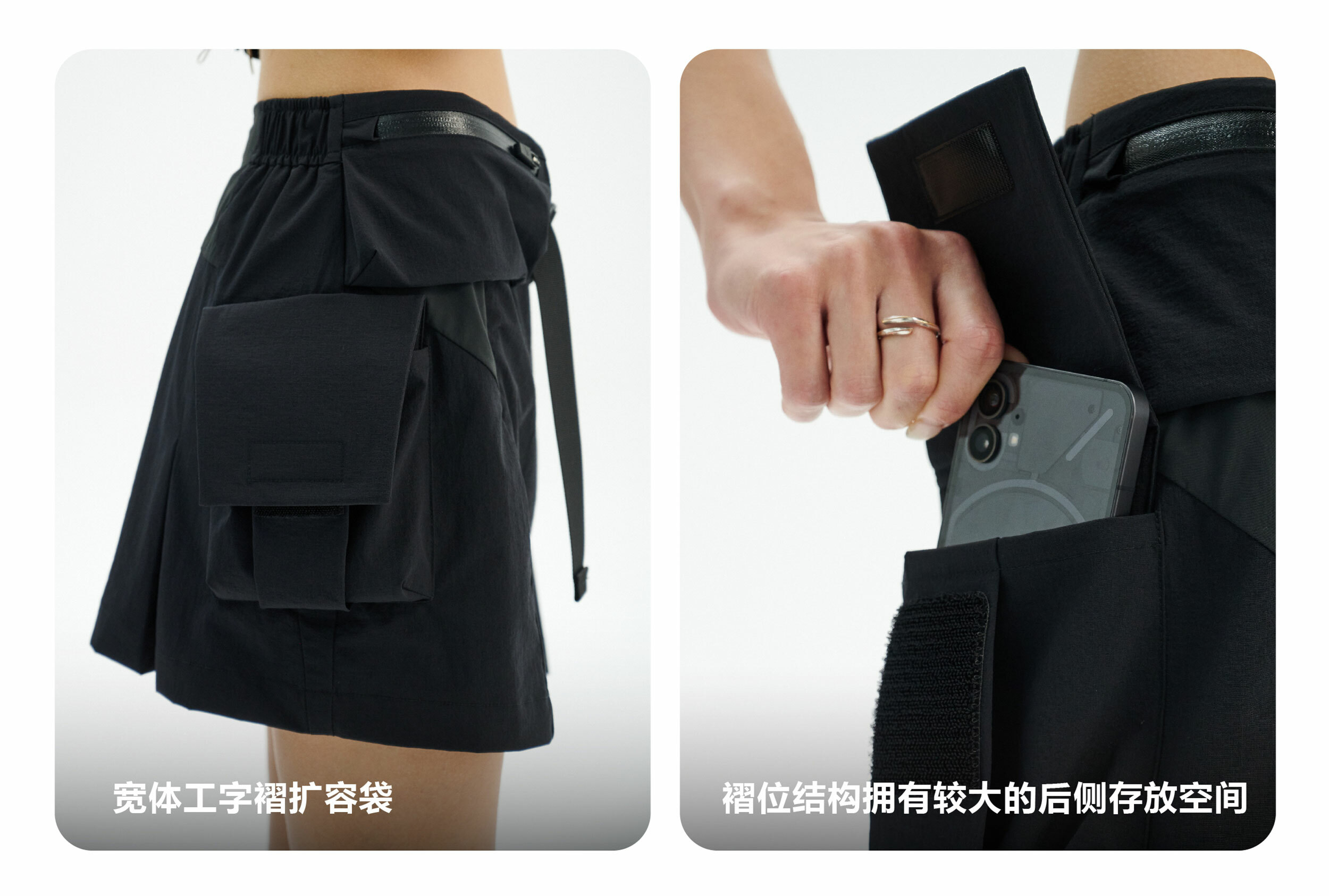 Curved slim line structure pioneering functional short skirt. The width of the hem can be adjusted to accommodate and modify more different body shapes.