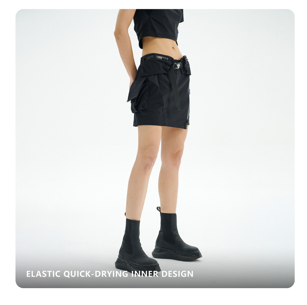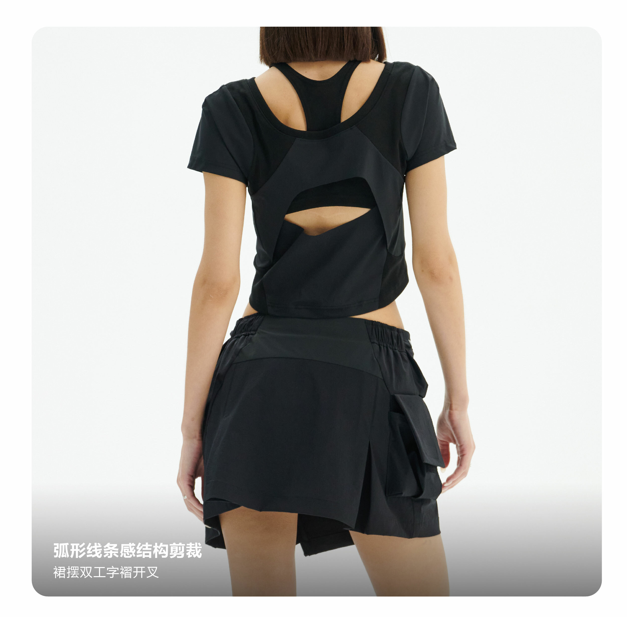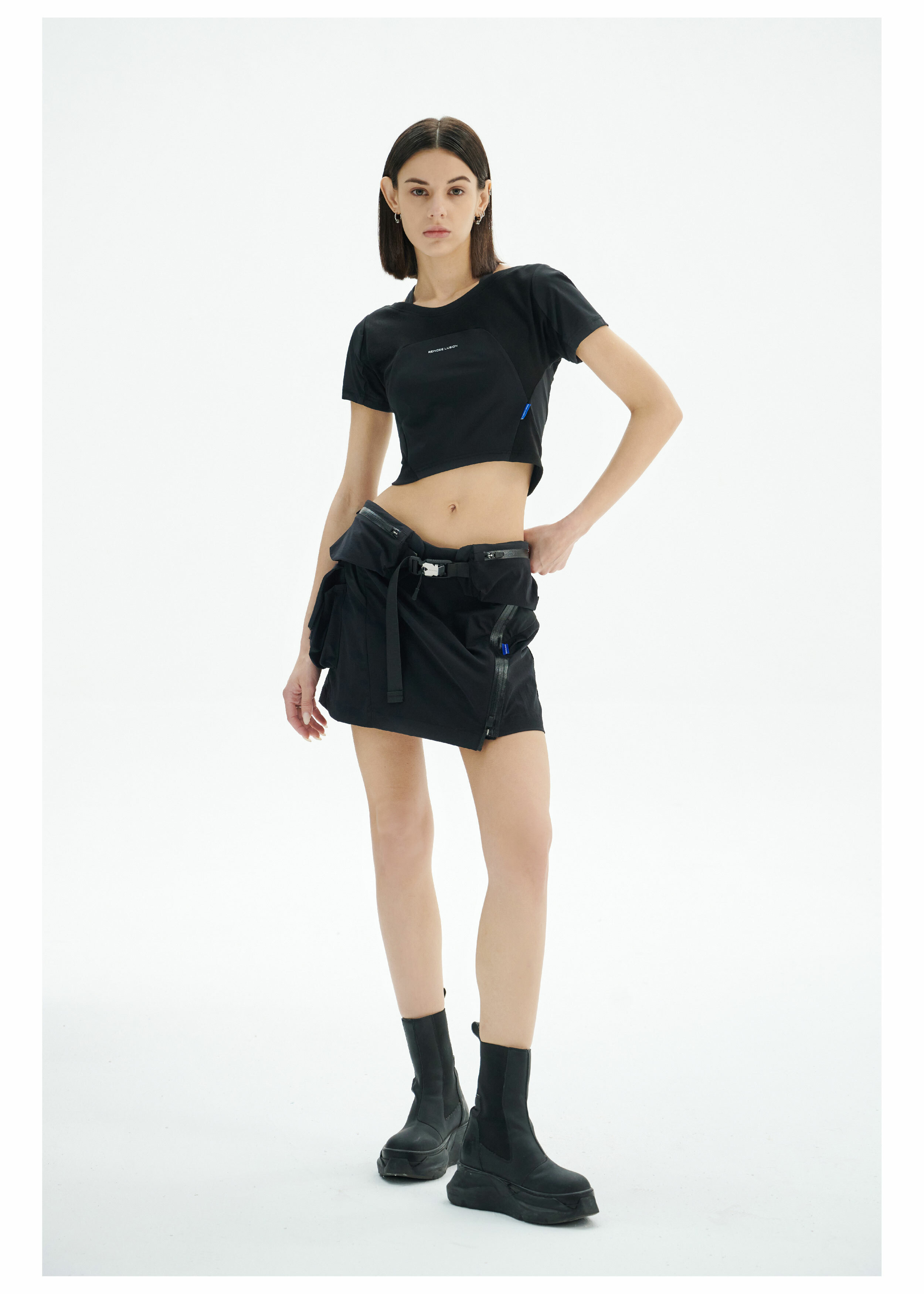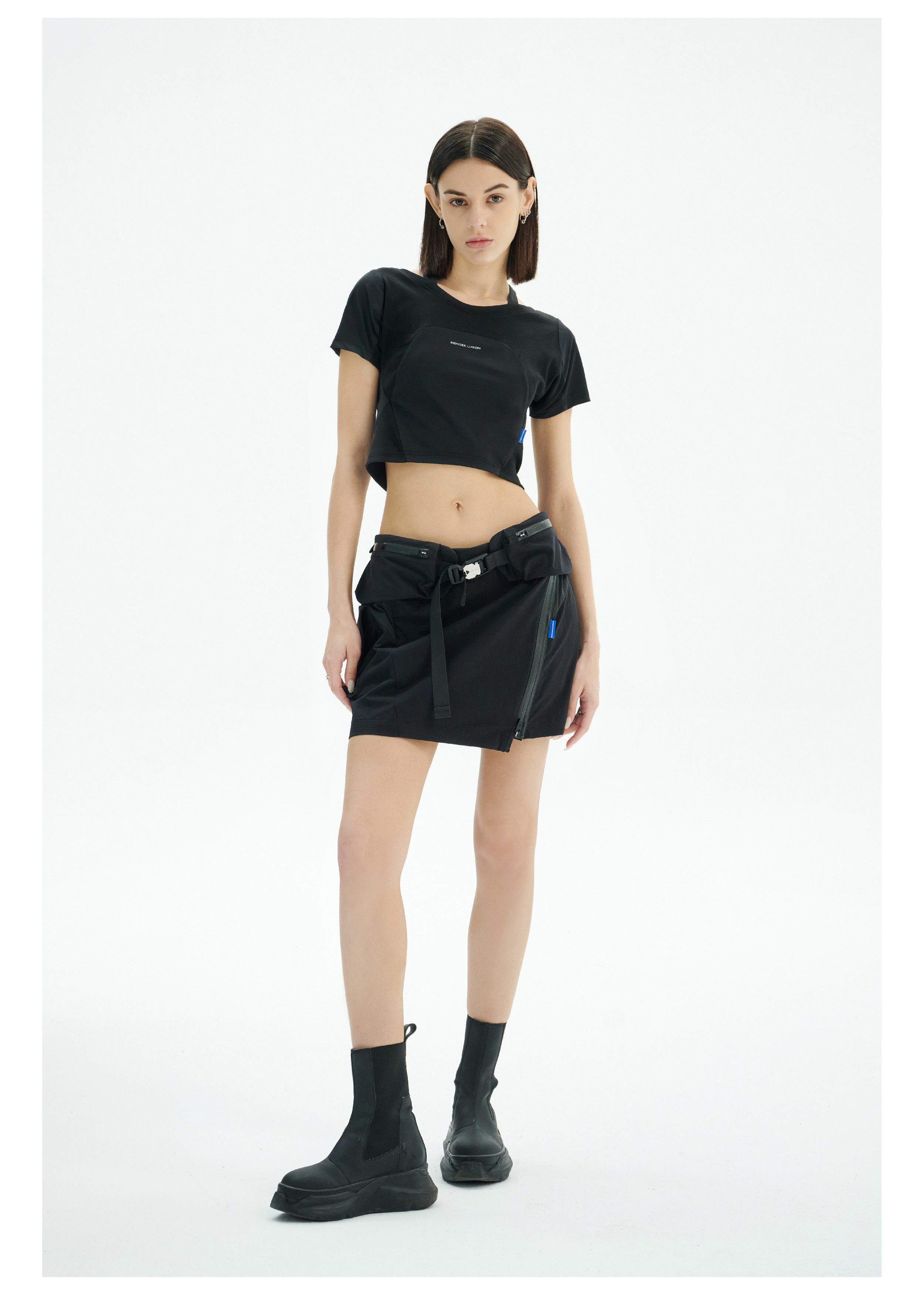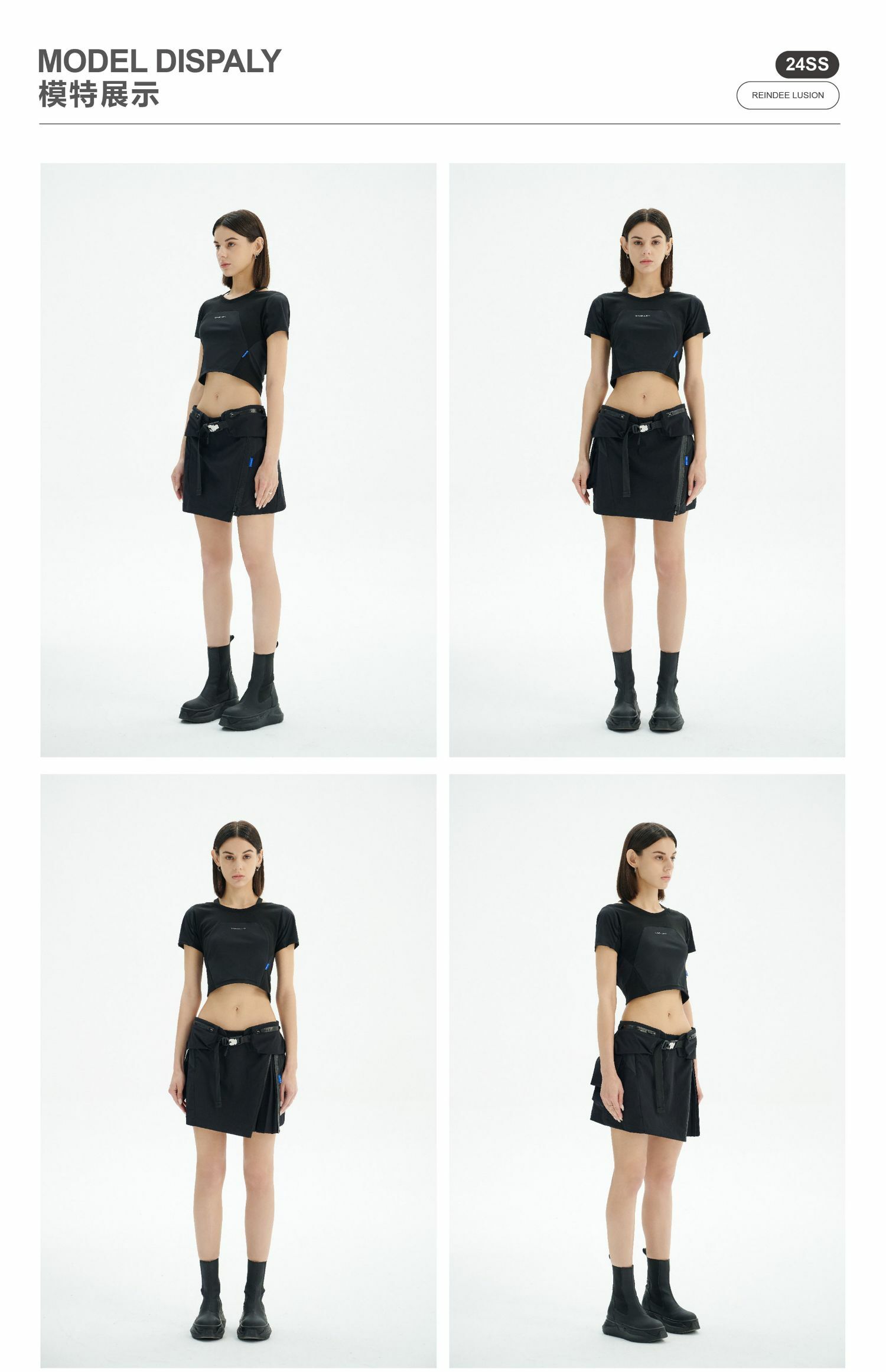 Curved slim line structure pioneering functional short skirt. The width of the hem can be adjusted to accommodate and modify more different body shapes.