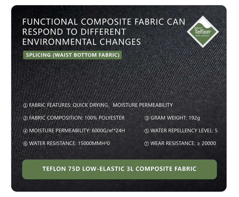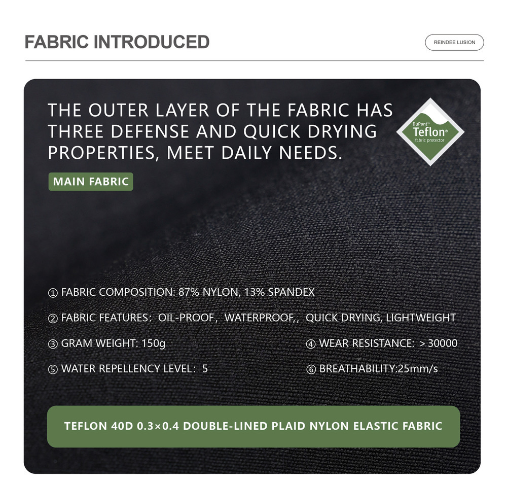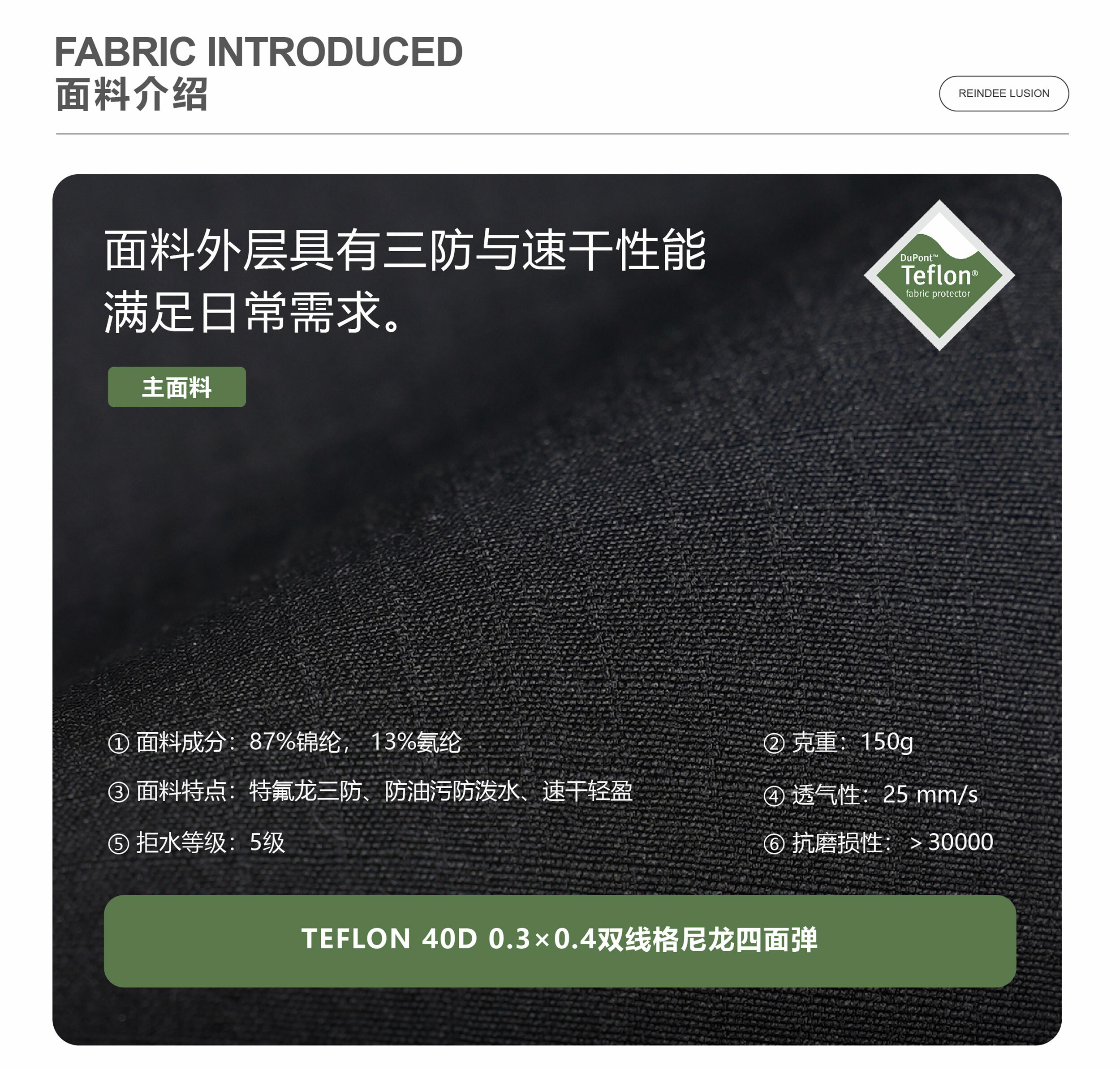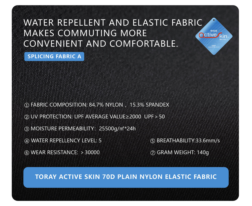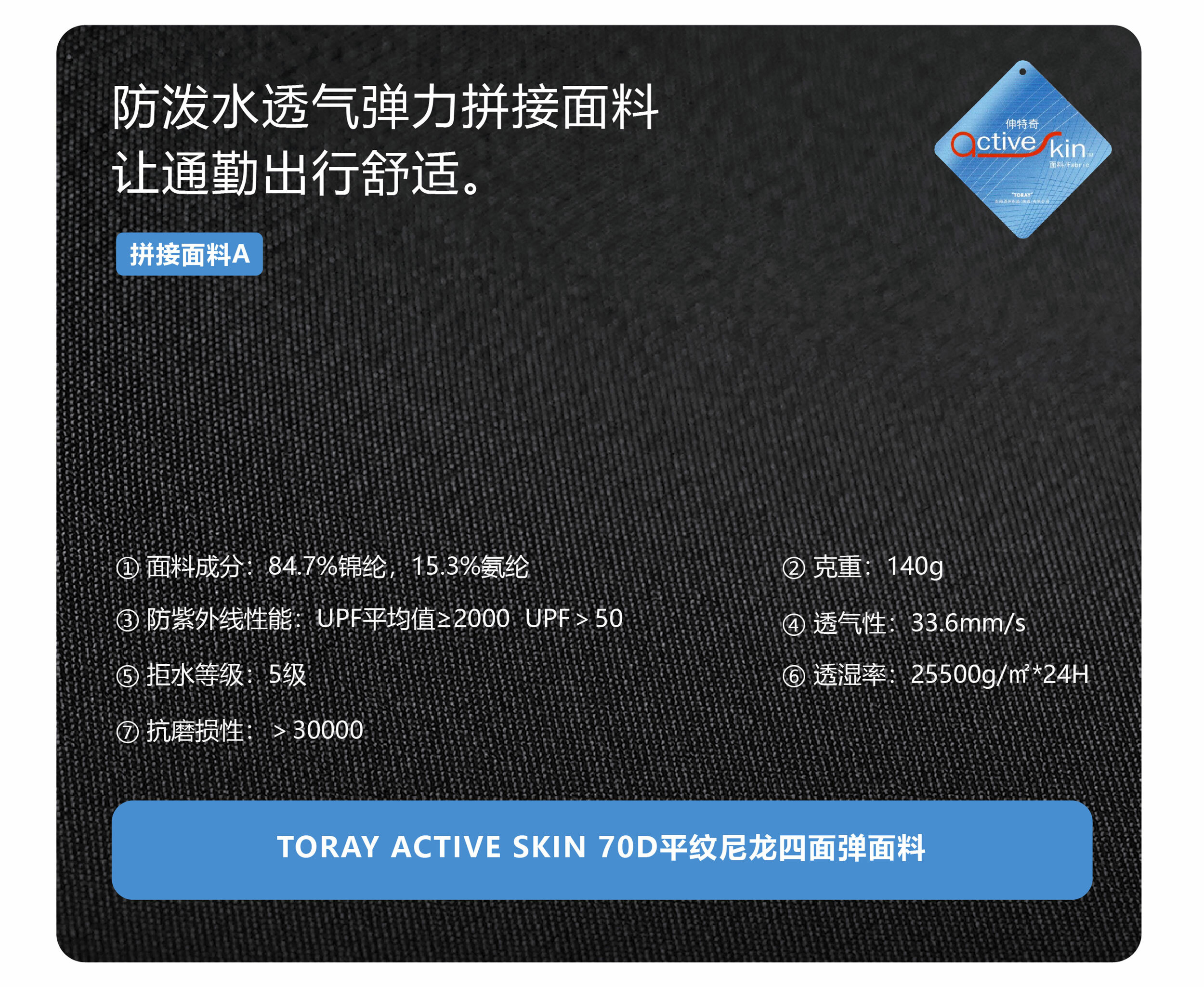 The outer layer of the fabric has three defense and quick drying properties, meet daily needs. Water repellent and elastic fabric makes commuting more convenient and comfortable. Functional composite fabric can respond to different environmental changes Elastic fabric characteristics makes it soft and not stuffy when worn. | |||||||||