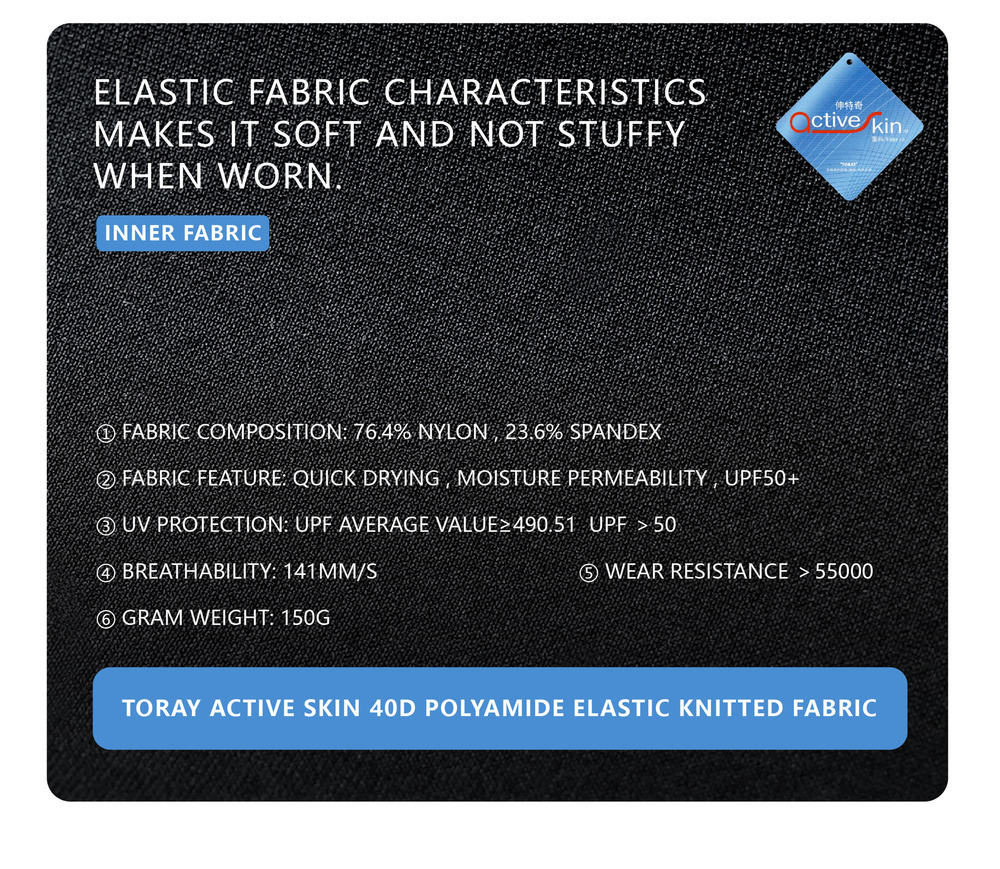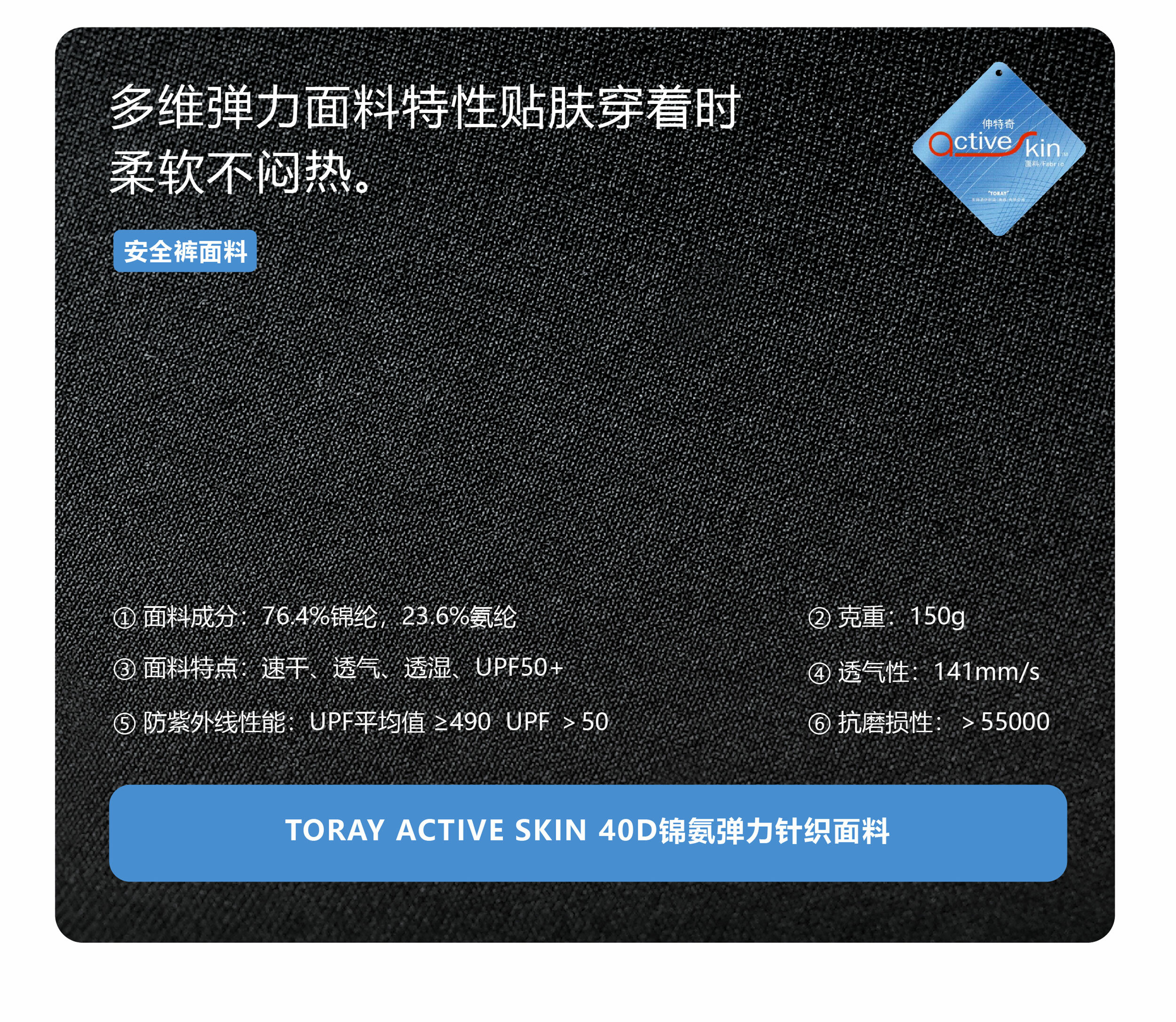 The main fabric:87%nylon,13%spandex Splicing A: 84.7%nylon,15.3%spandex Splicing B:87%nylon,100%polyester Inner fabric:76.4%nylon,23.6%spandex |