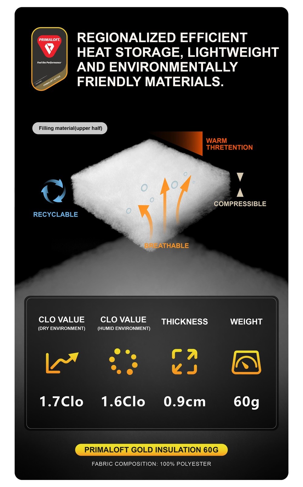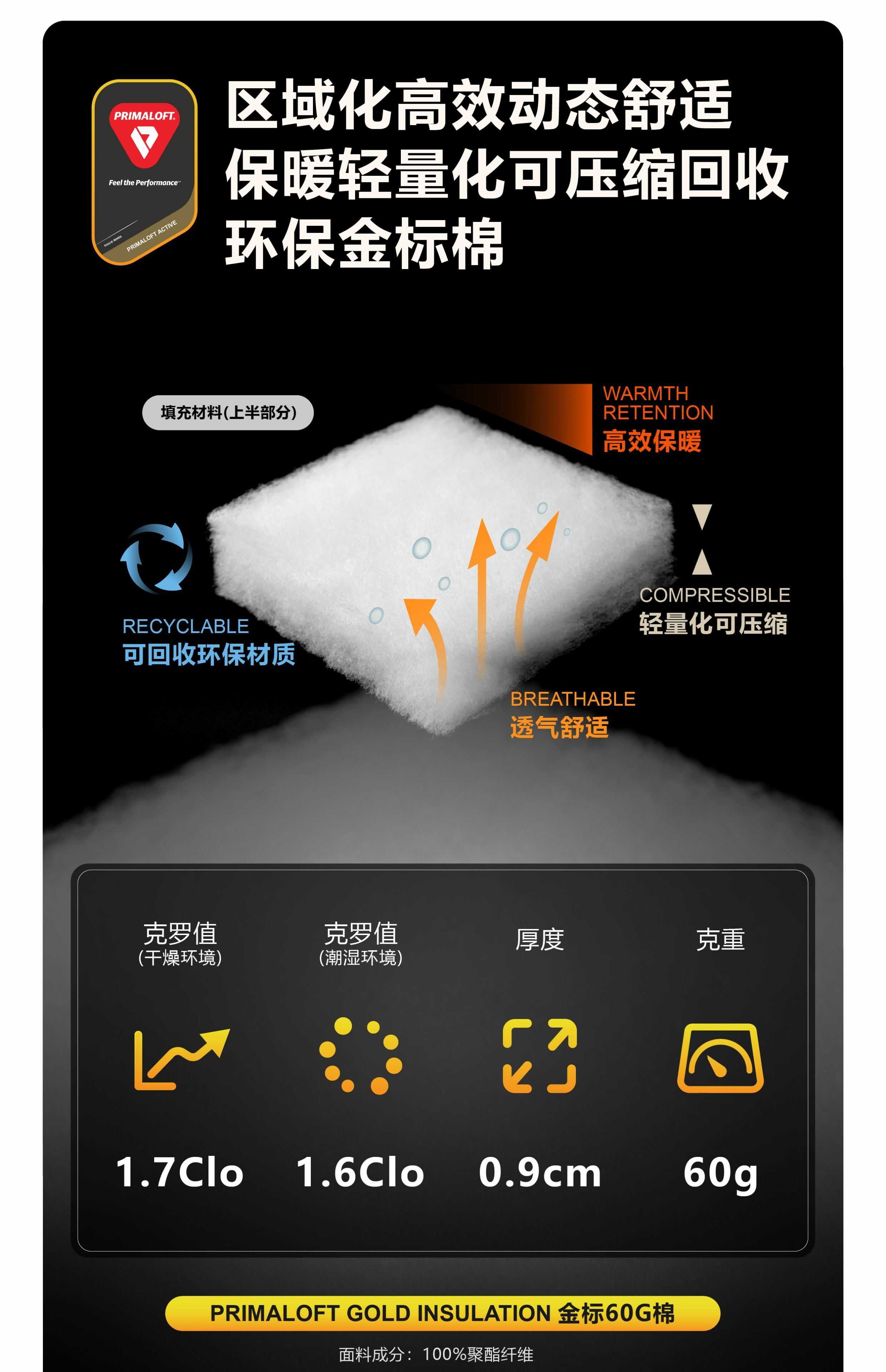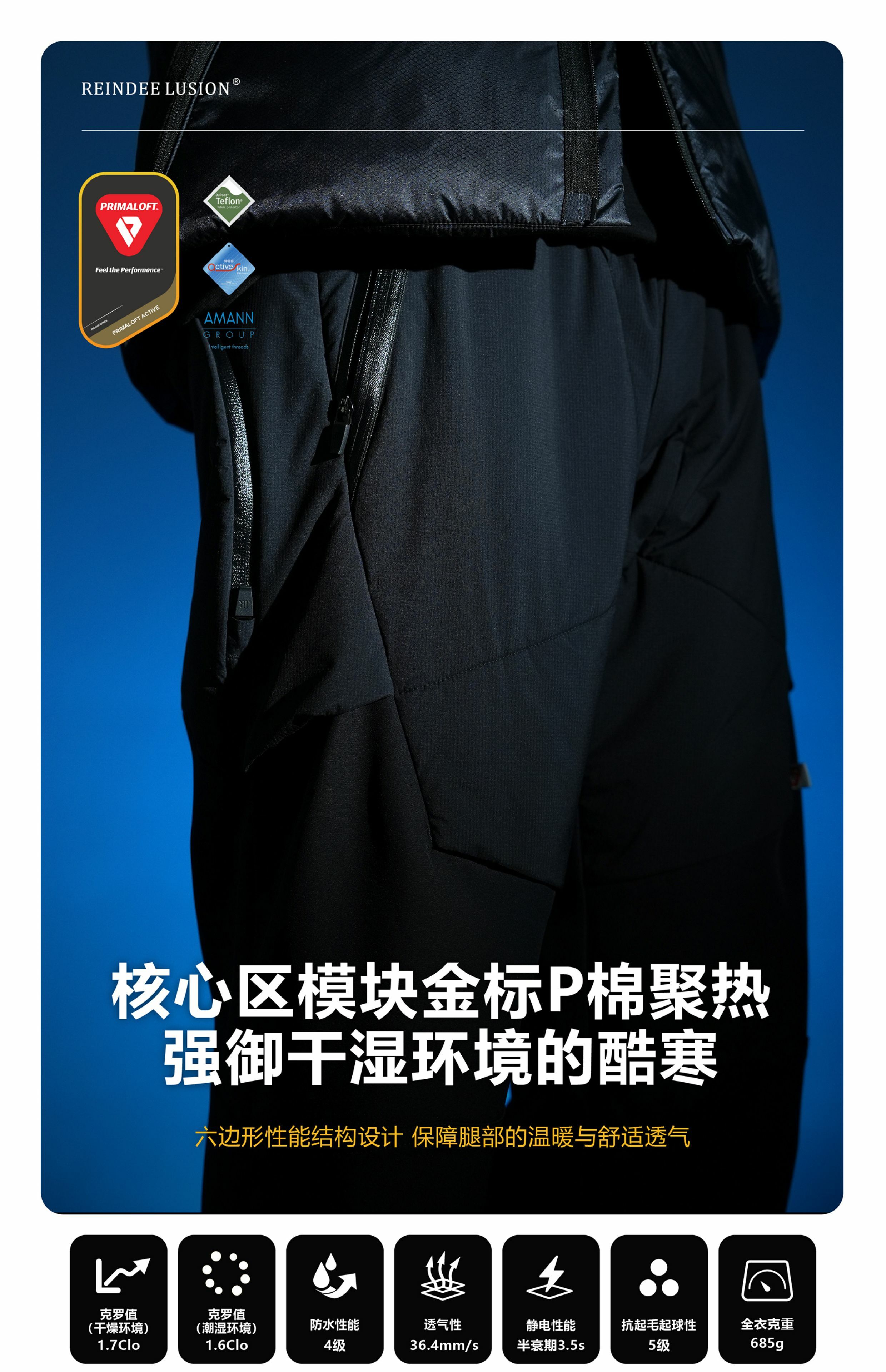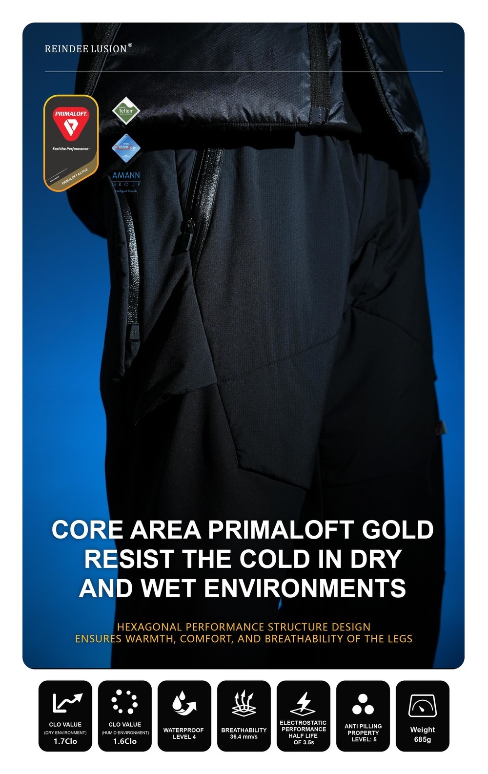 Core area PRIMALOFT gold,resist the cold in dry and wet environments. Hexagonal performance structure design ensures warmth, comfort, and breathability of the legs. | |||||||||
