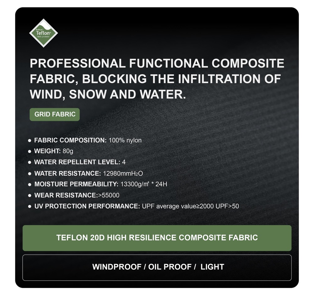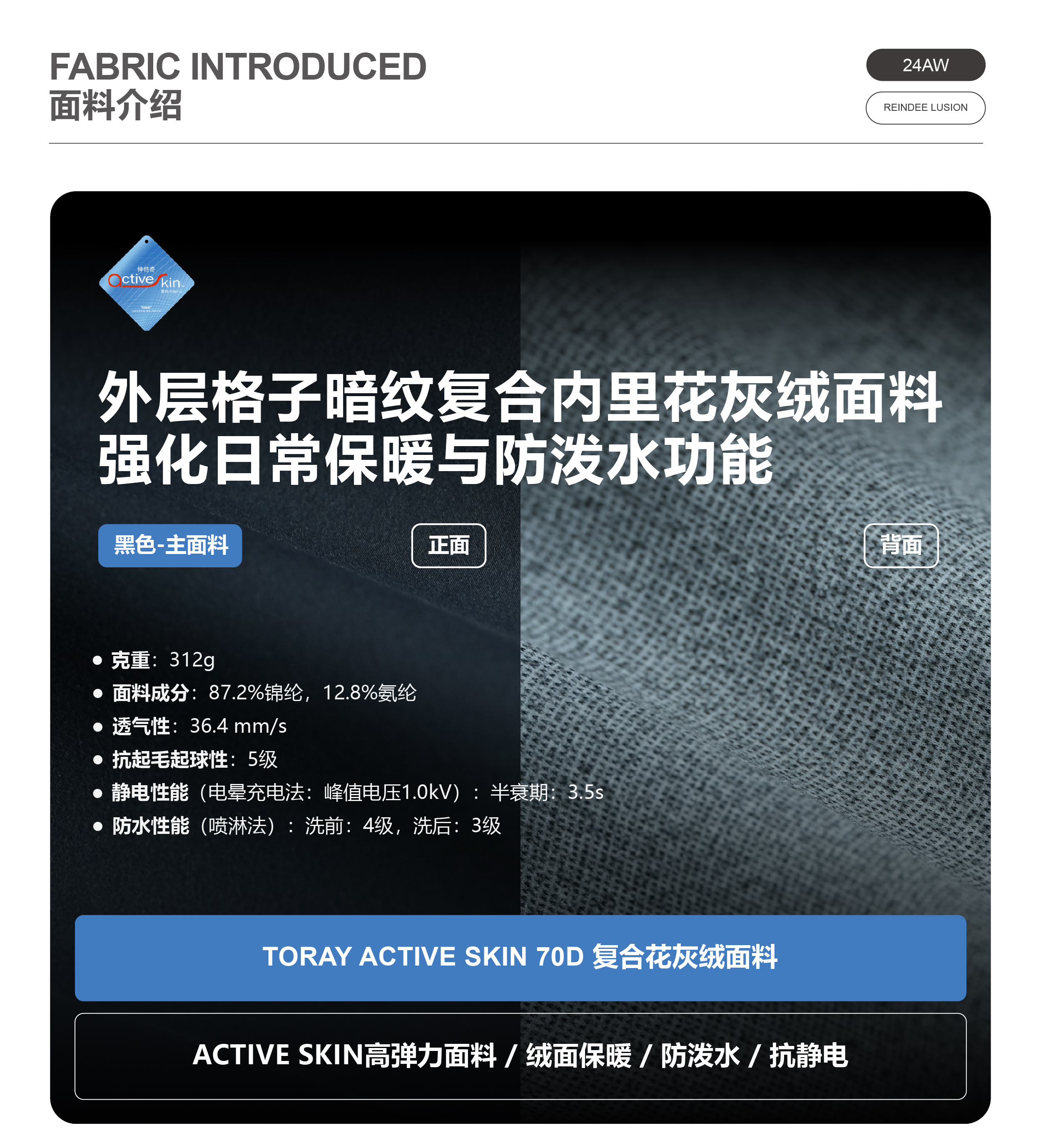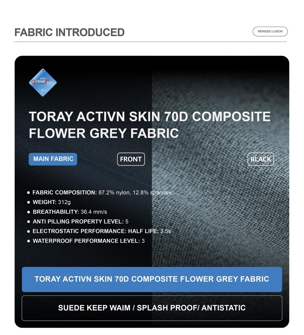 Waterproof Level: 4 Breathability: 36.4 mm/s Anti pilling property Level: 5 Electrostatic performance: Half life of 3.5s Weight: 685g | |||||||||