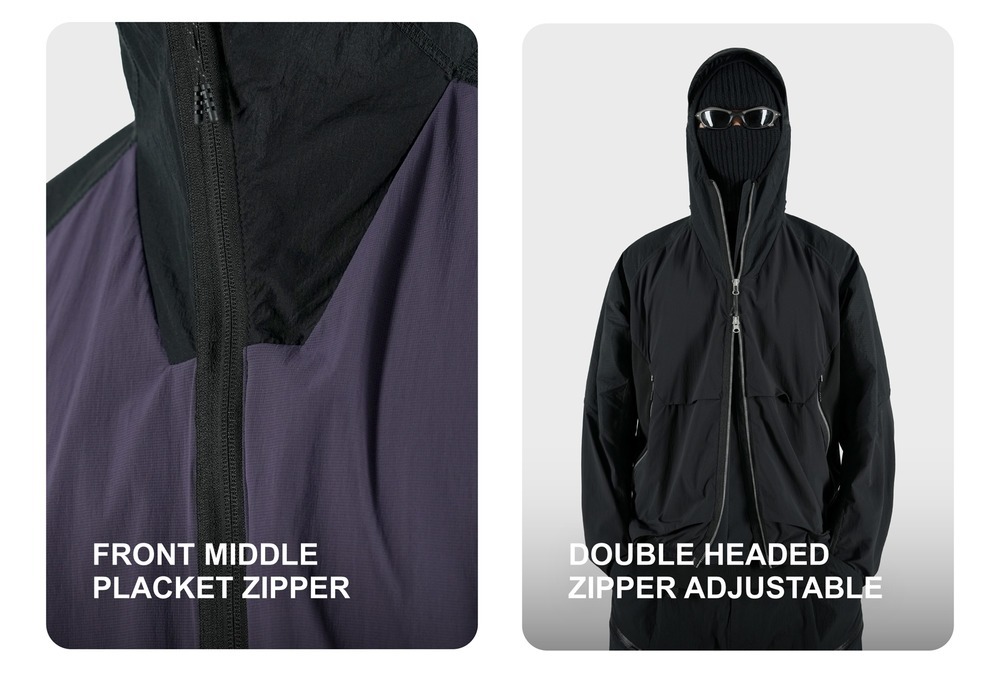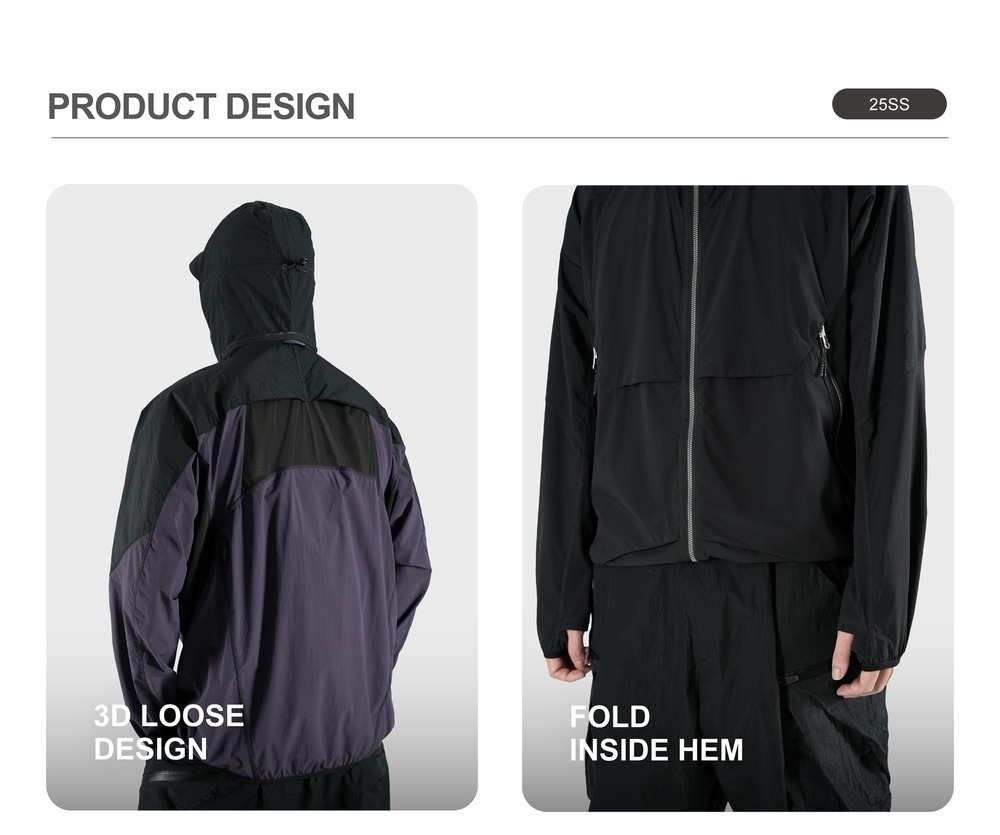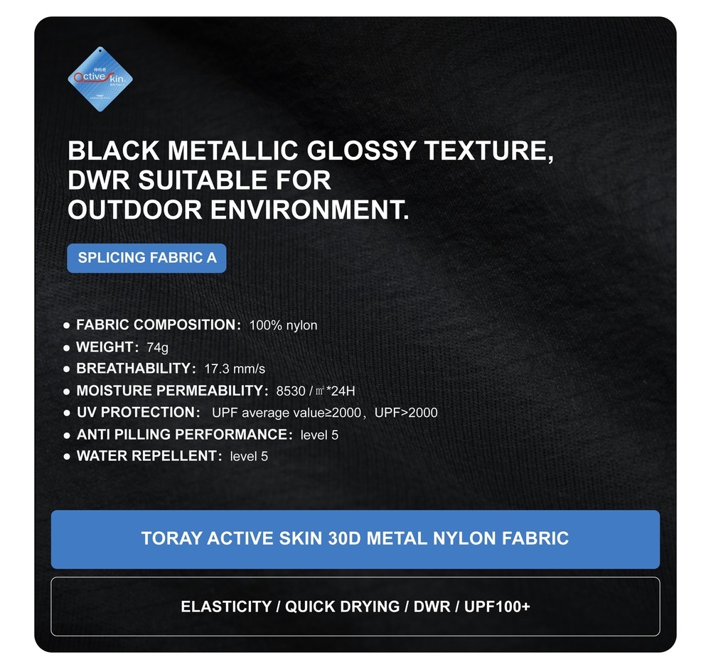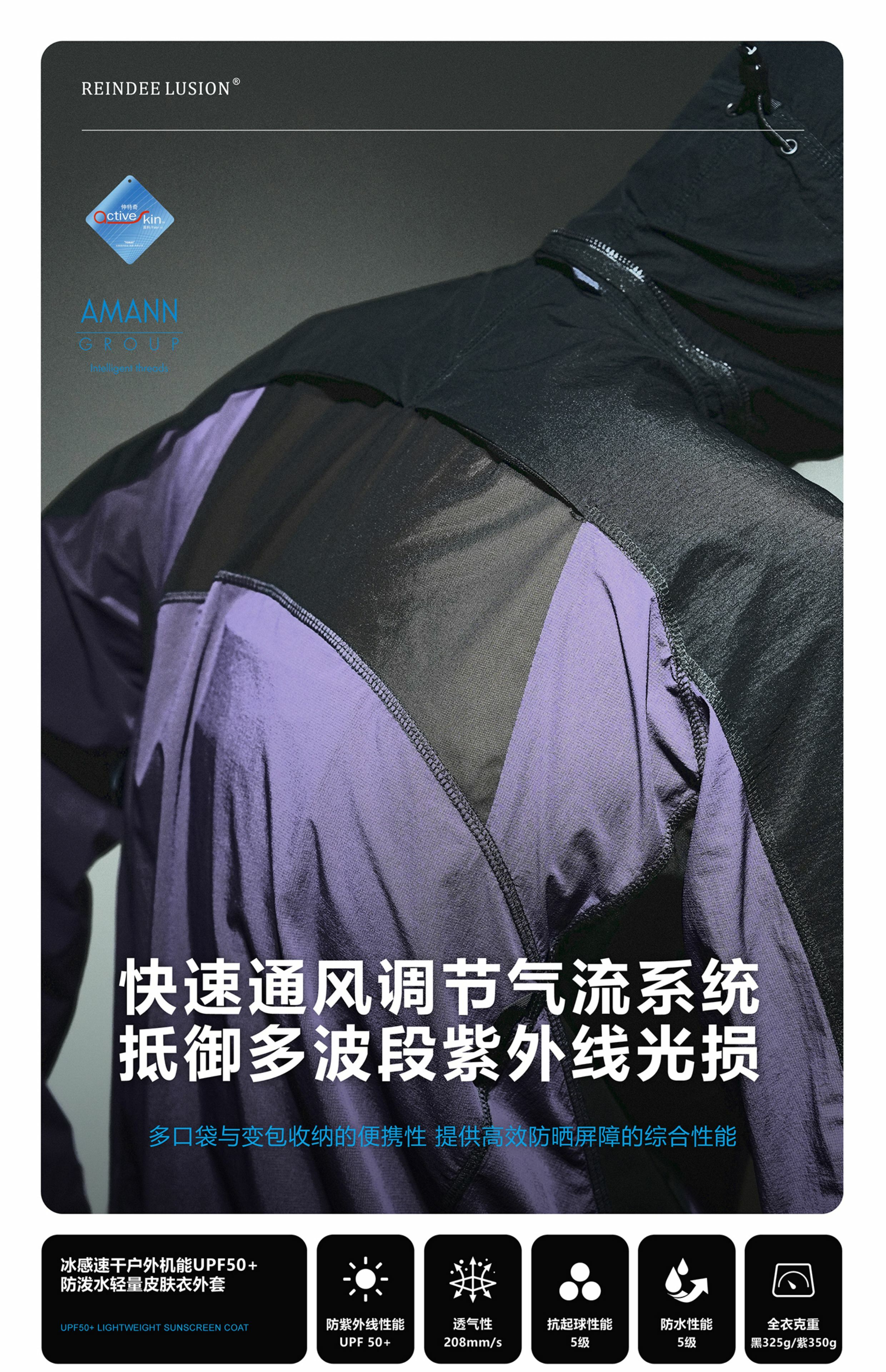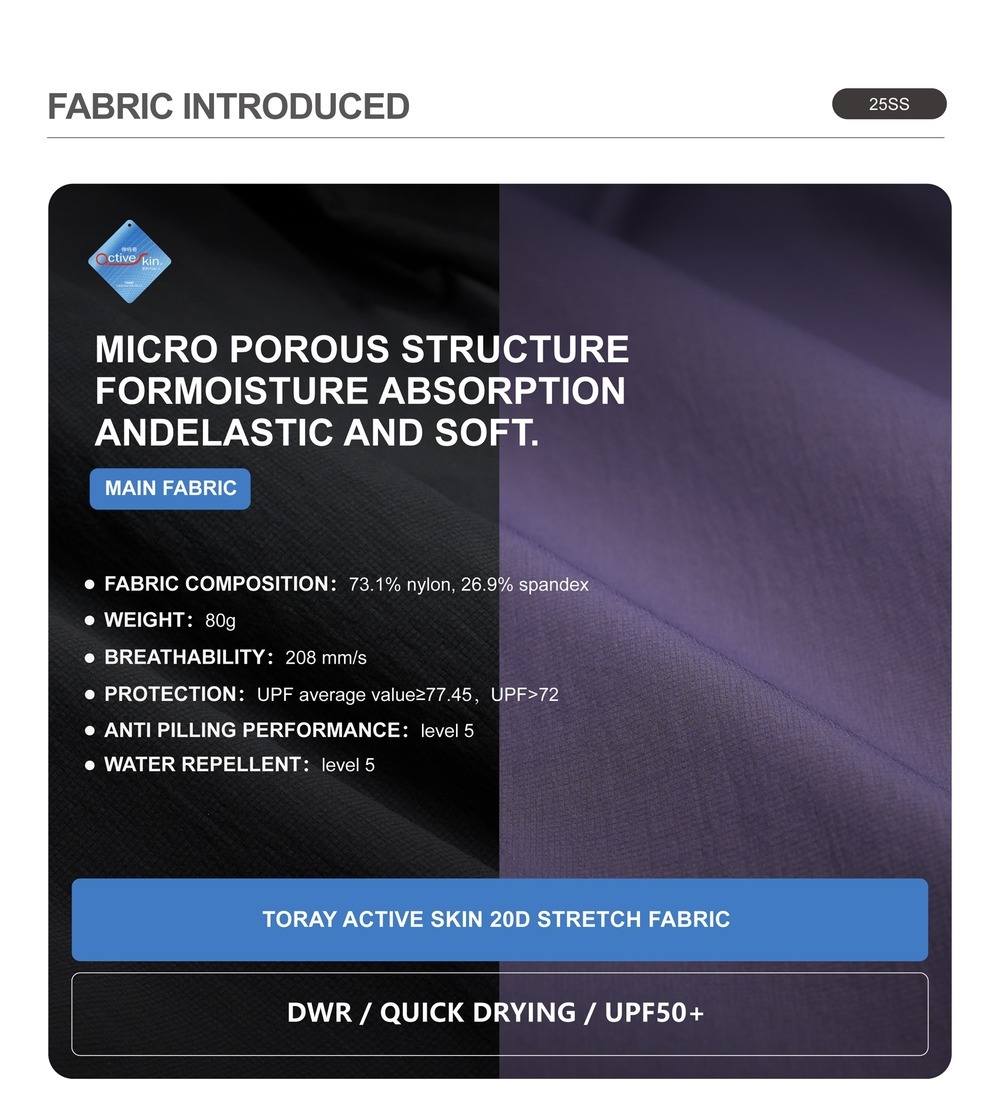 Breathability: 208 mm/s UV protection : UPF 50+ Anti pilling level: 5 Waterproof performance Level:5 Weight:Black:325g , purple:350g | |||||||||