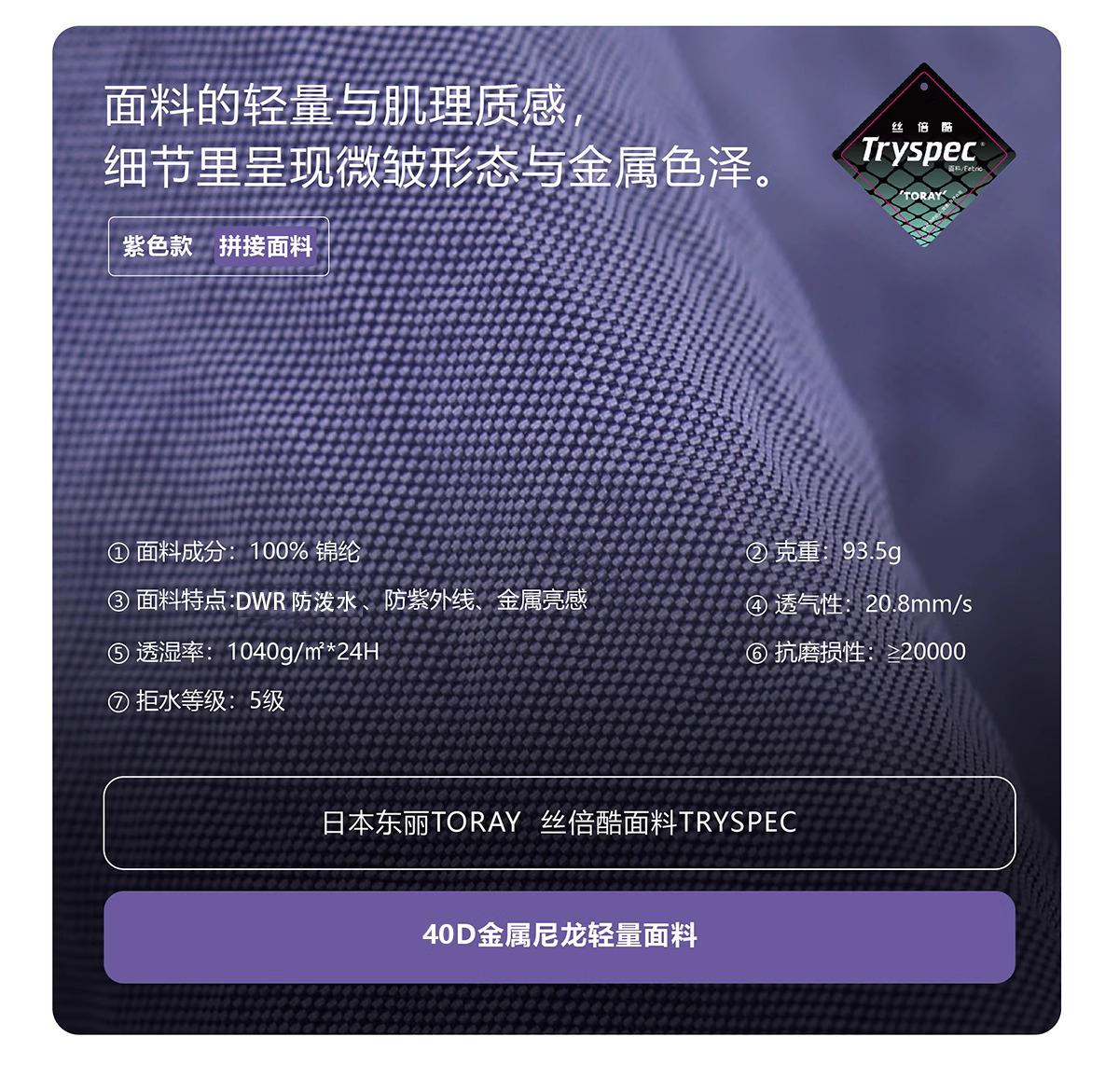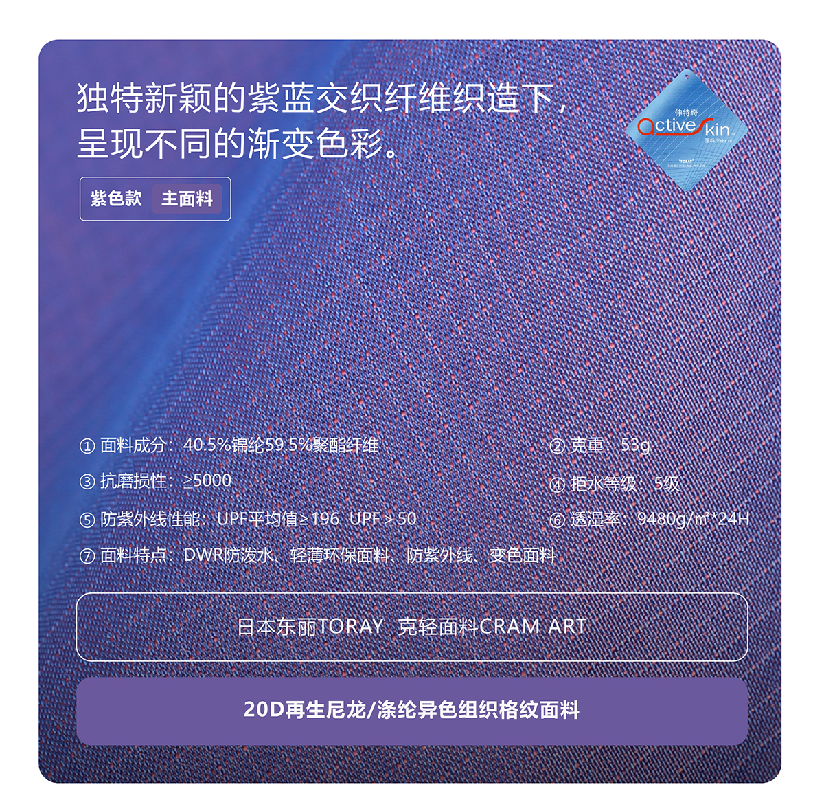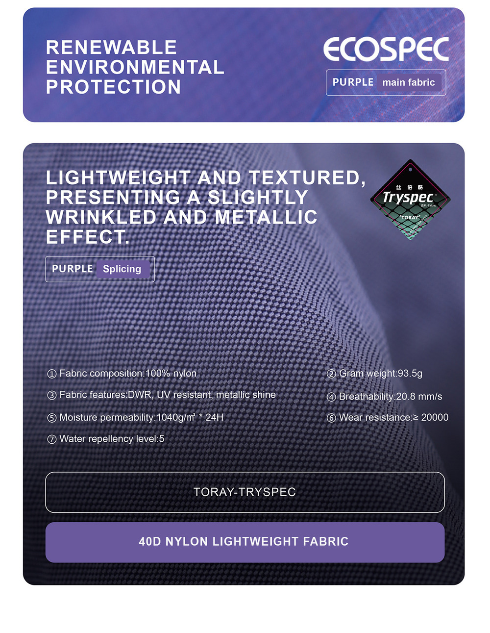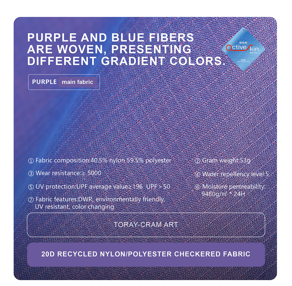 | Presents different angles of texture and slightly wrinkled visual effects. Purple and blue fibers are woven, presenting different gradient colors. Lightweight and textured, presenting a slightly wrinkled and metallic effect.