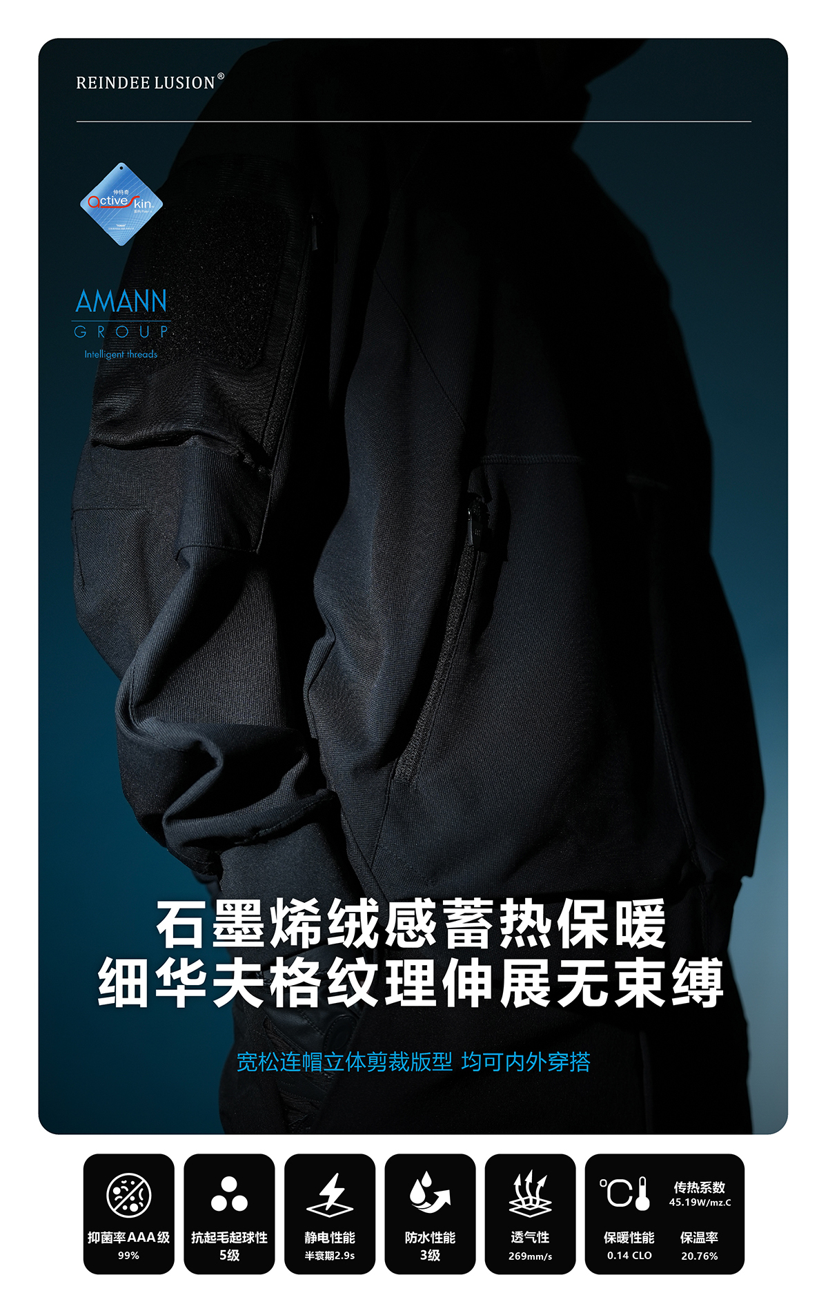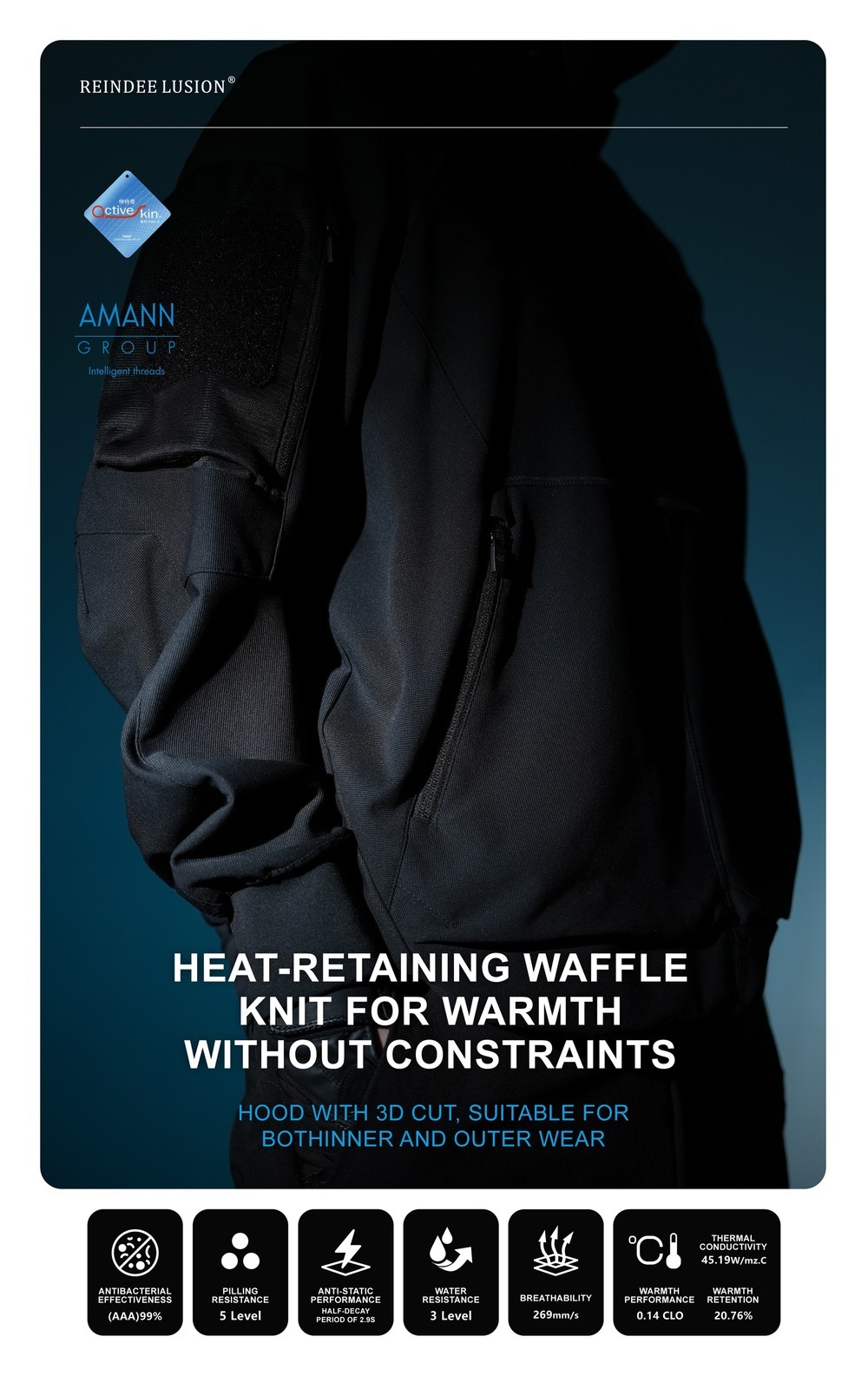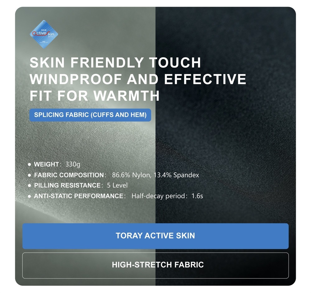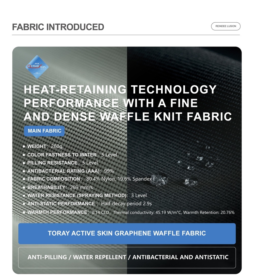 Water resistance:3 Level Breathability: 269 mm/s Pilling resistance:5 Level Anti-static performance: Half-decay period of 2.9s Antibacterial effectiveness(AAA): 99% Warmth performance: 0.14 CLO, Thermal conductivity: 45.19 W/m°C, Warmth Retention: 20.76% | |||||||||