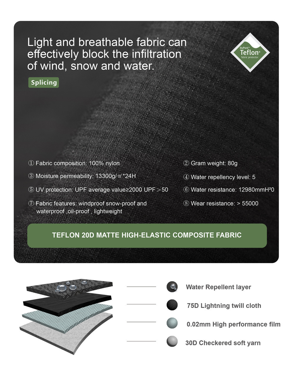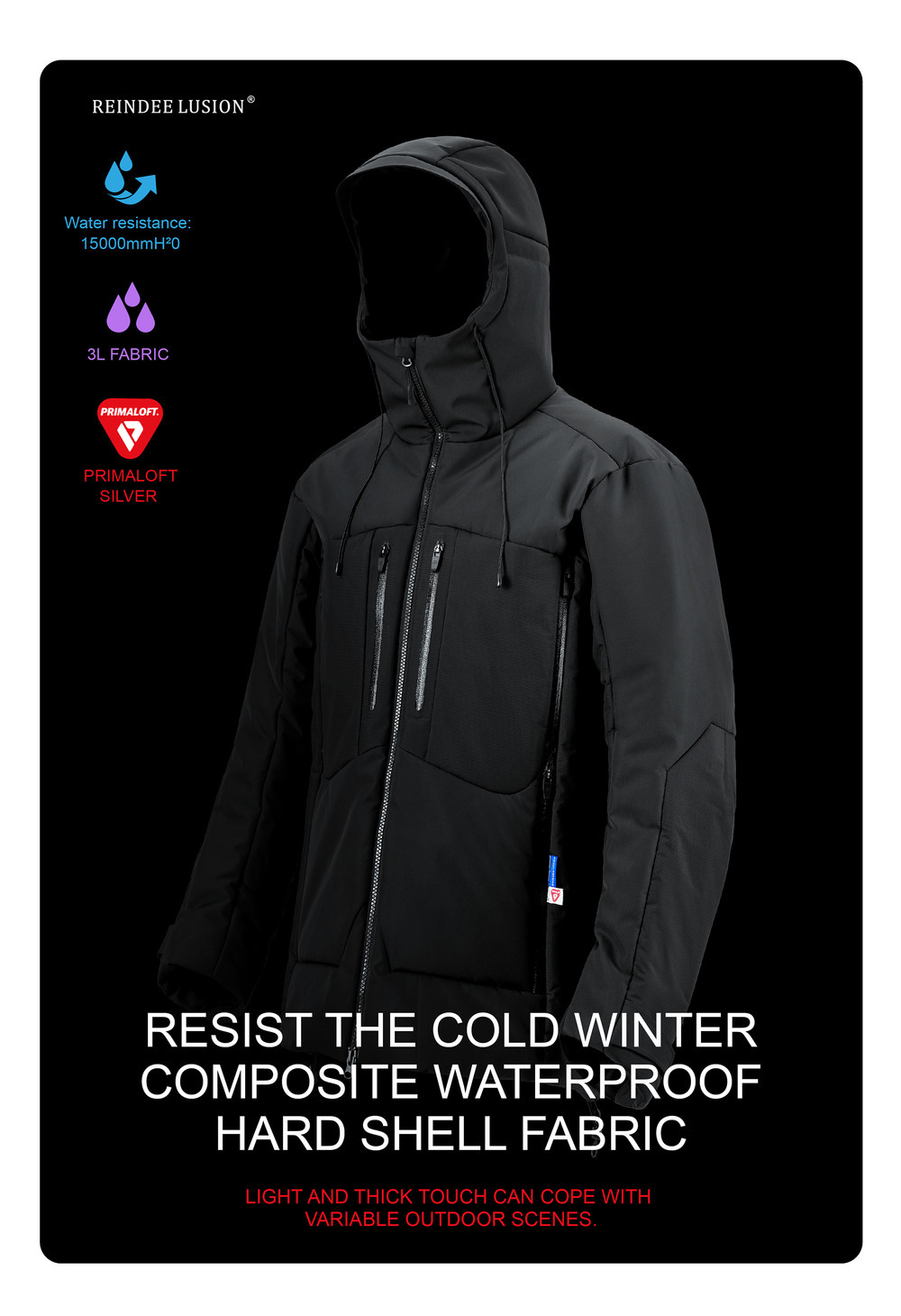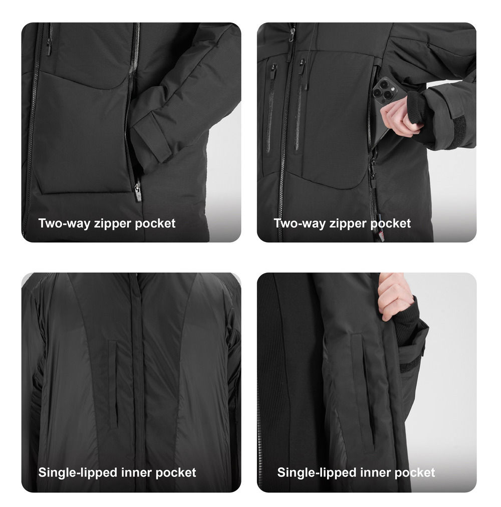 RESIST THE COLD WINTER,COMPOSITE WATERPROOF HARD SHELL FABRIC.LIGHT AND THICK TOUCH CAN COPE WITH VARIABLE OUTDOOR SCENES.HIGH-PERFORMANCE TECHNOLOGY TO KEEP WARM FOR A LONG TIME.FUNCTIONAL COMPOSITE FABRIC CAN RESIST WIND AND SNOW AND KEEP THE BODY COMFORTABLE.LIGHT AND BREATHABLE FABRIC CAN EFFECTIVELY BLOCK THE INFILTRATION OF WIND, SNOW AND WATER.