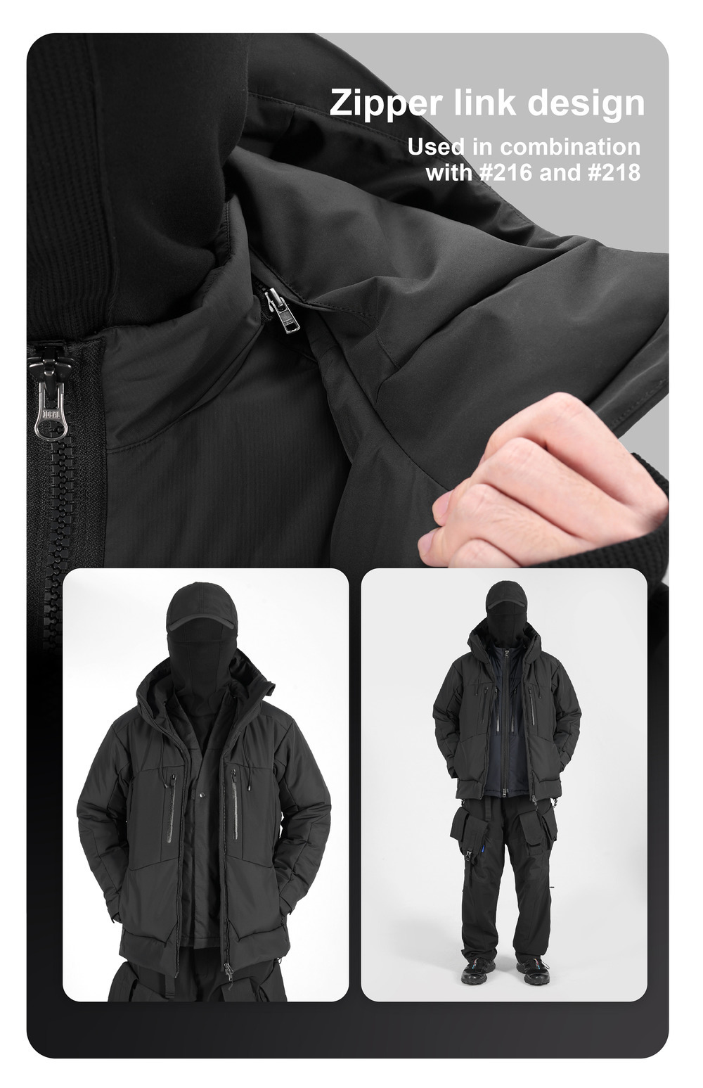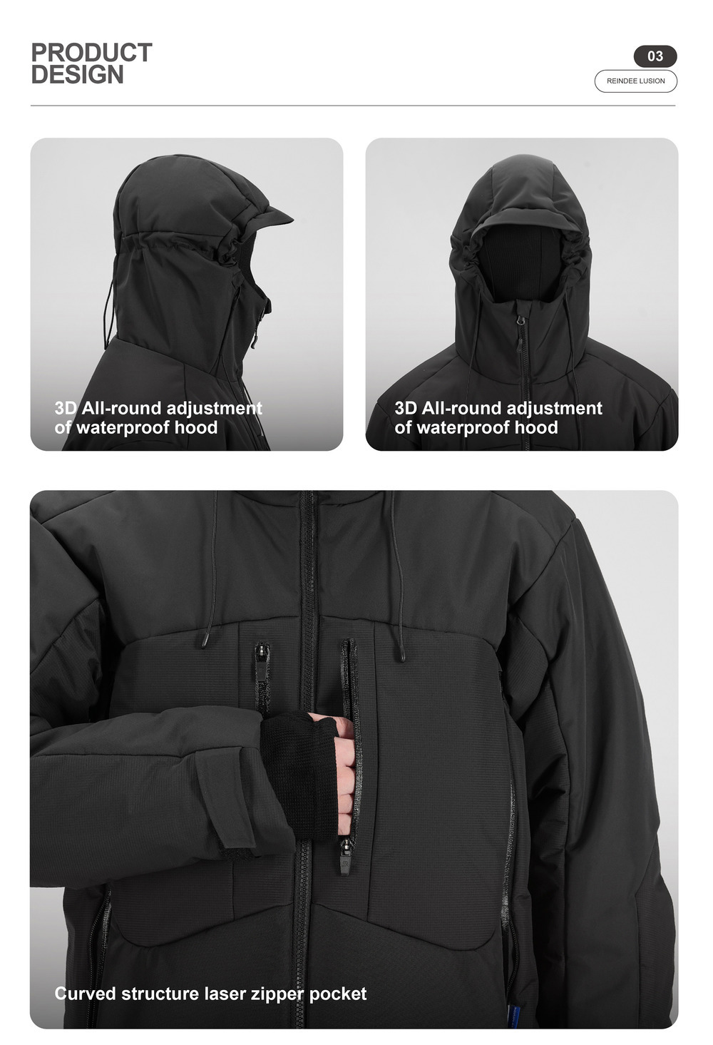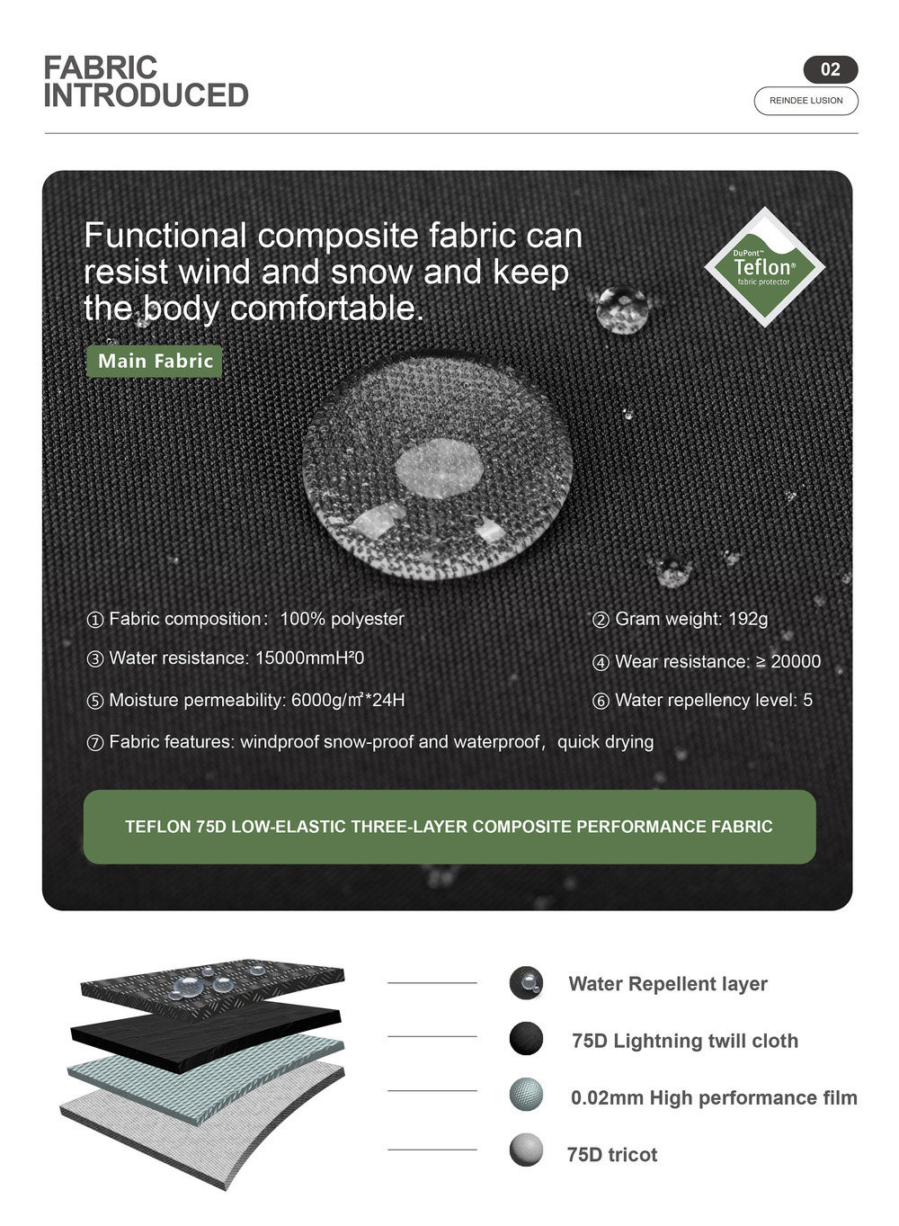 RESIST THE COLD WINTER,COMPOSITE WATERPROOF HARD SHELL FABRIC.LIGHT AND THICK TOUCH CAN COPE WITH VARIABLE OUTDOOR SCENES.HIGH-PERFORMANCE TECHNOLOGY TO KEEP WARM FOR A LONG TIME.FUNCTIONAL COMPOSITE FABRIC CAN RESIST WIND AND SNOW AND KEEP THE BODY COMFORTABLE.LIGHT AND BREATHABLE FABRIC CAN EFFECTIVELY BLOCK THE INFILTRATION OF WIND, SNOW AND WATER.