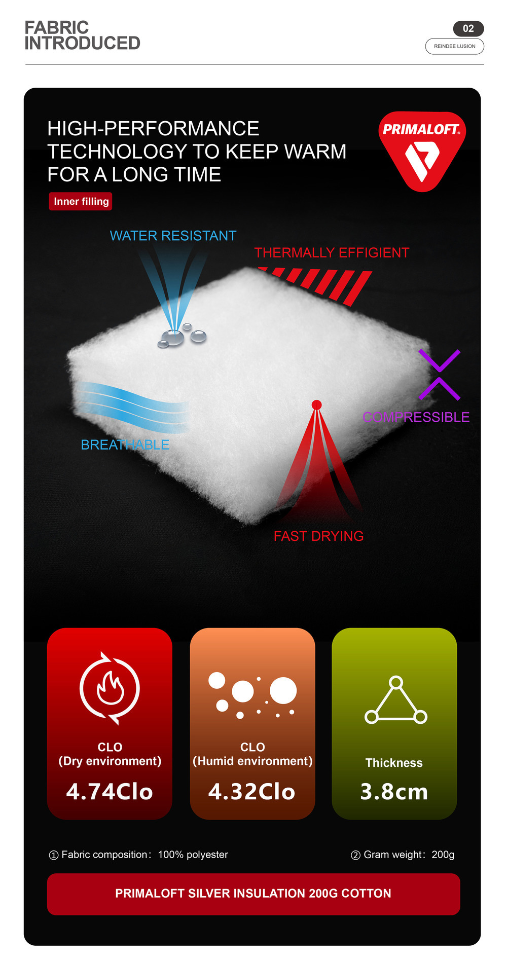 The main fabric:100%polyester Splicing A:100%nylon Lining: 100%nylon Inner filling:Primaloft Silver Insulation 200g Cotton,100%Polyester |